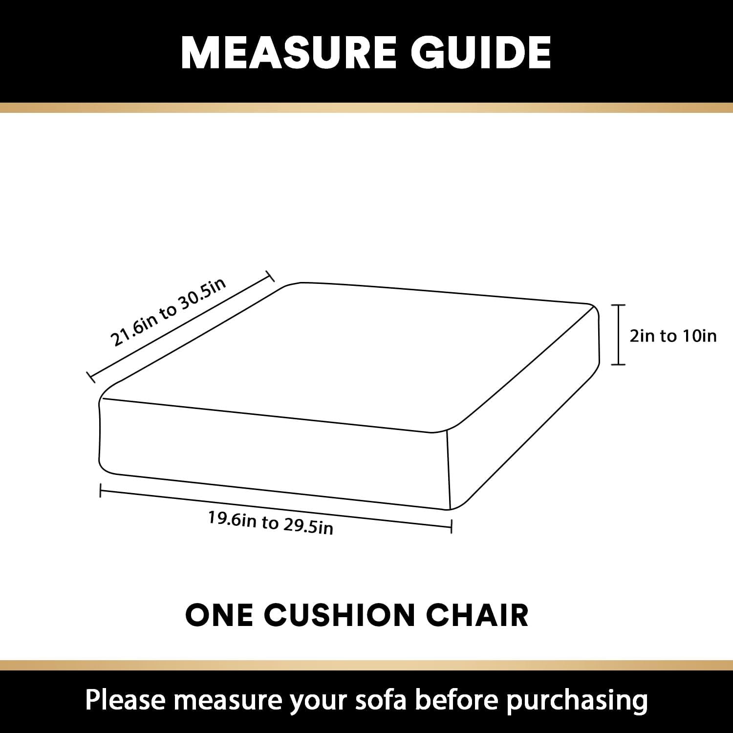 - GREAT FIT:1 piece seat cushion covers included. Each cushion cover measures: 19.6-29.5" length, 21.6-30.5" width and 2-10" thickness (height). PrinceDeco couch cushion covers are as close to custom as you can reasonably purchase. High recommended for both leather and cloth furniture.