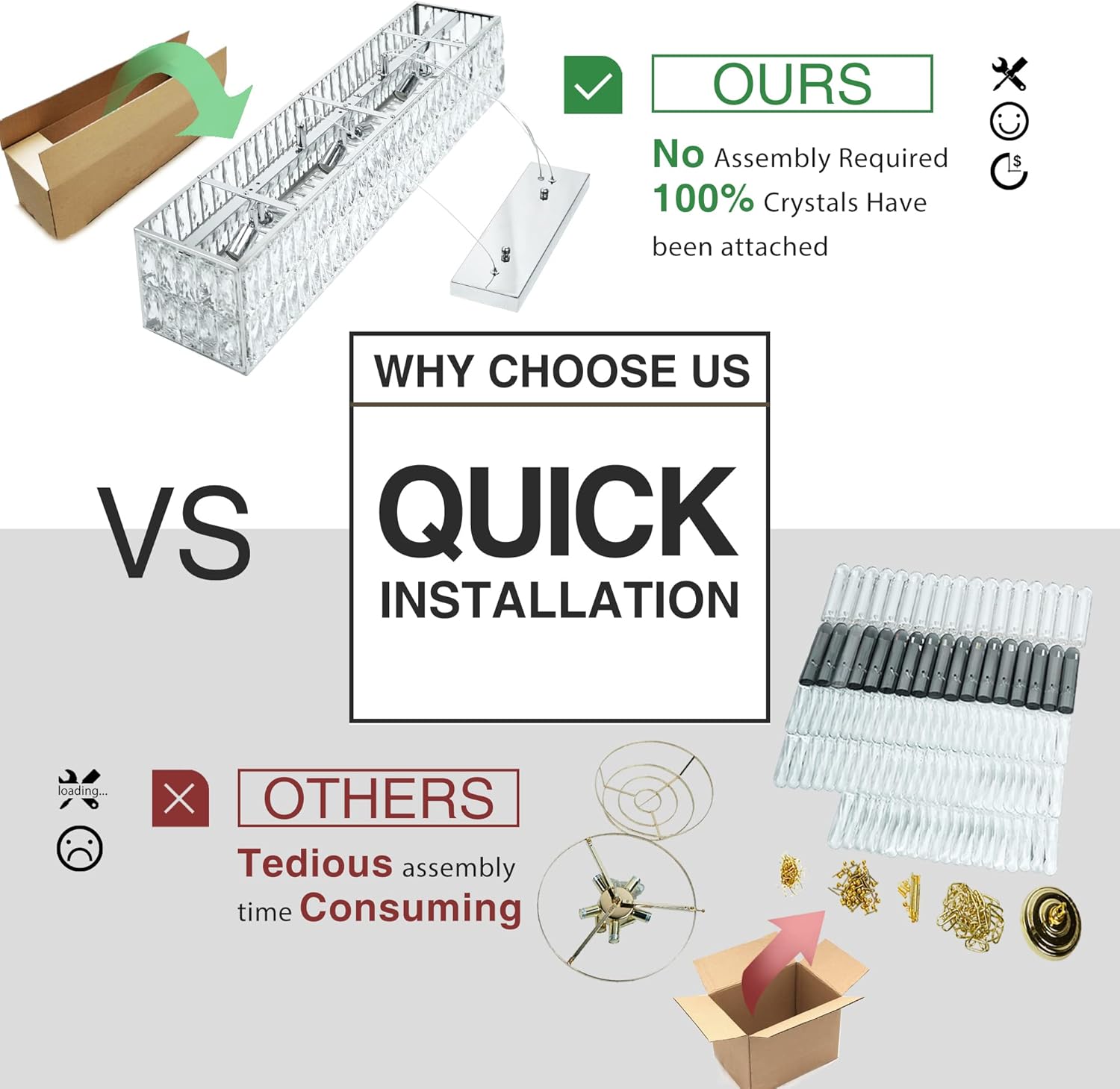- [NO ASSEMBLY REQUIRED ]: 100% crystals of the luxe chandelier light fixture have been attached. Just take it and mount it on ceiling. 2 buttons on the canopy for quick height adjustment. The set-up will take no more than 30 minutes. Compatible with both flat and slanted ceiling.