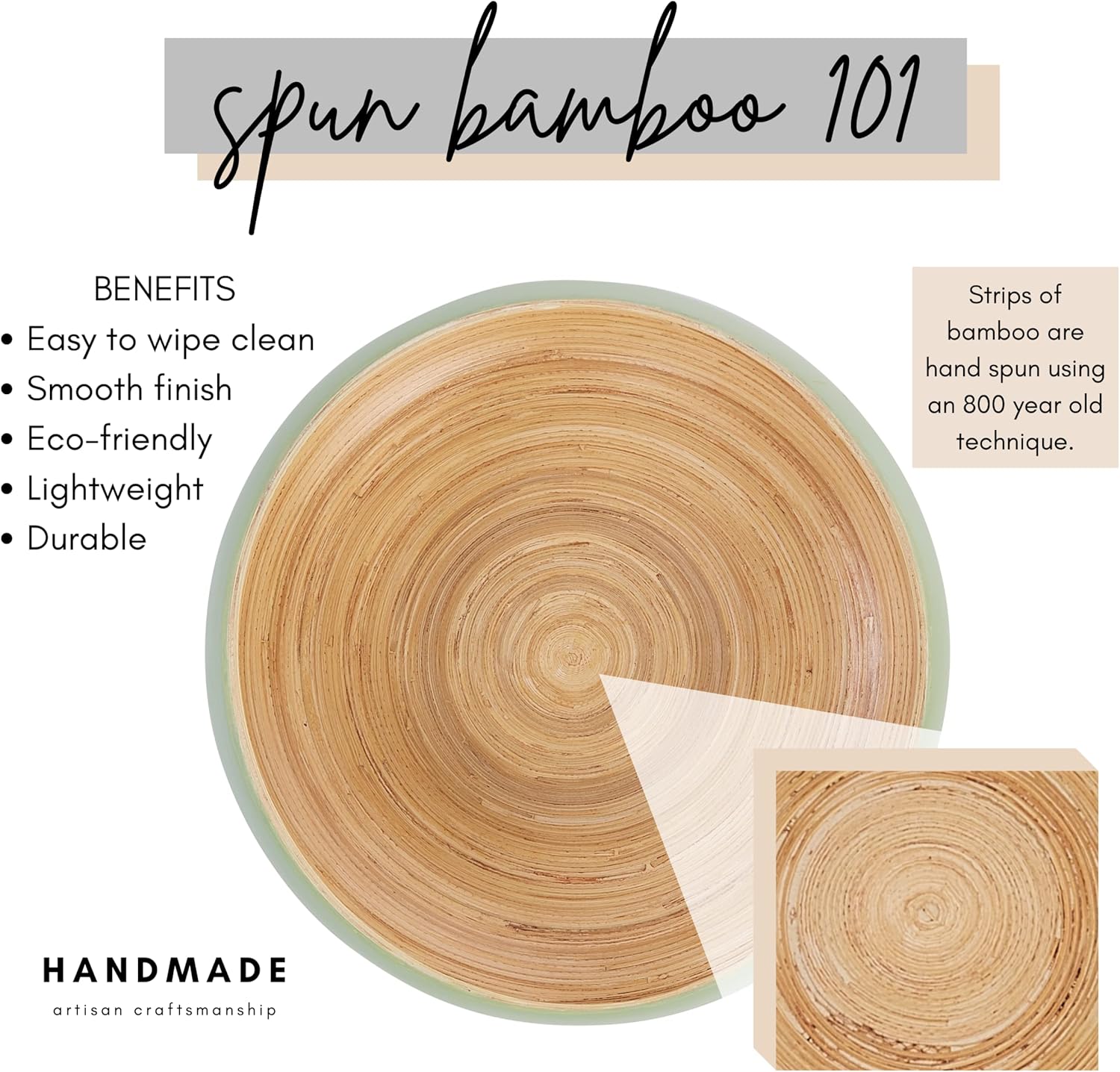 - Add the warmth of handmade, natural materials to your home while keeping a modern, sleek look and feel with this spun bamboo bowl, whether you need a fruit bowl for kitchen counter, decorative bowl for the living room, or centerpiece for the dining table.