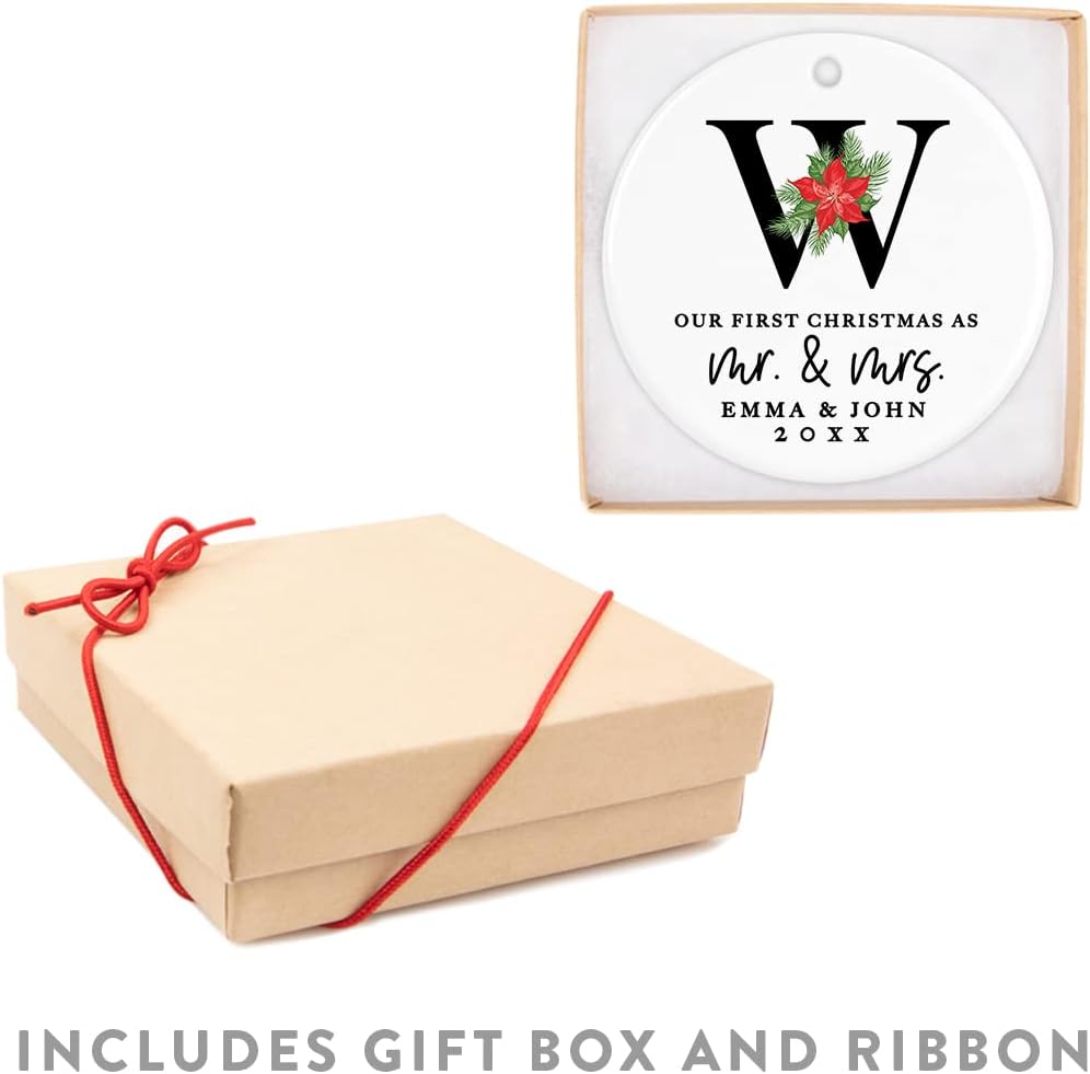 Andaz Press Personalized Our First Christmas As Mr. & Mrs. 2025 Christmas Ornaments Monogram Poinsettia 2.8" Round Porcelain Ceramic 1st Year Married Custom Ornament Keepsake for Newlyweds 1-Pack