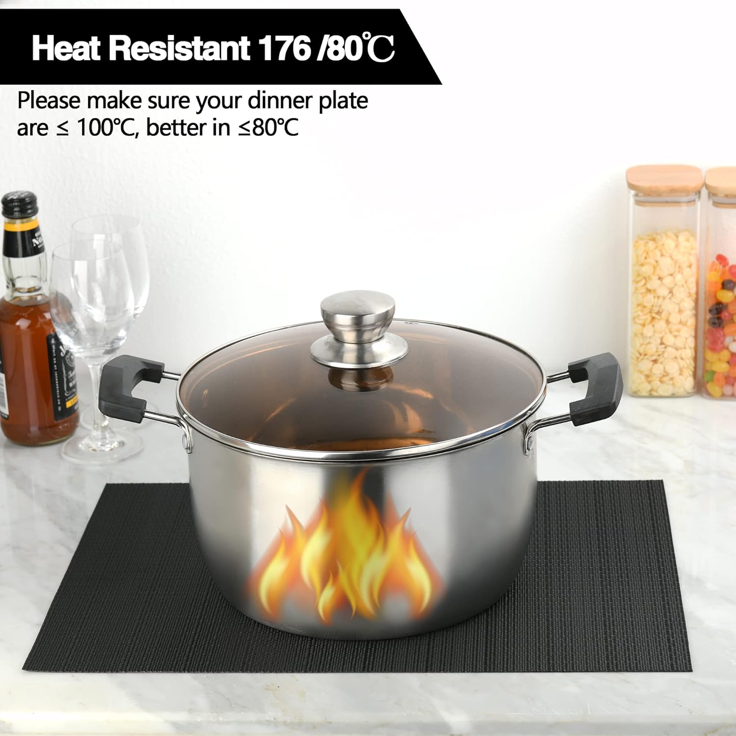 - Heat Resistant: Please make sure your dinner plate are ≤ 100℃, better in ≤80℃. It can prevent the table from slipping and scalding the countertop. These beautiful stylish vinyl place mats to add more fun to your dining table