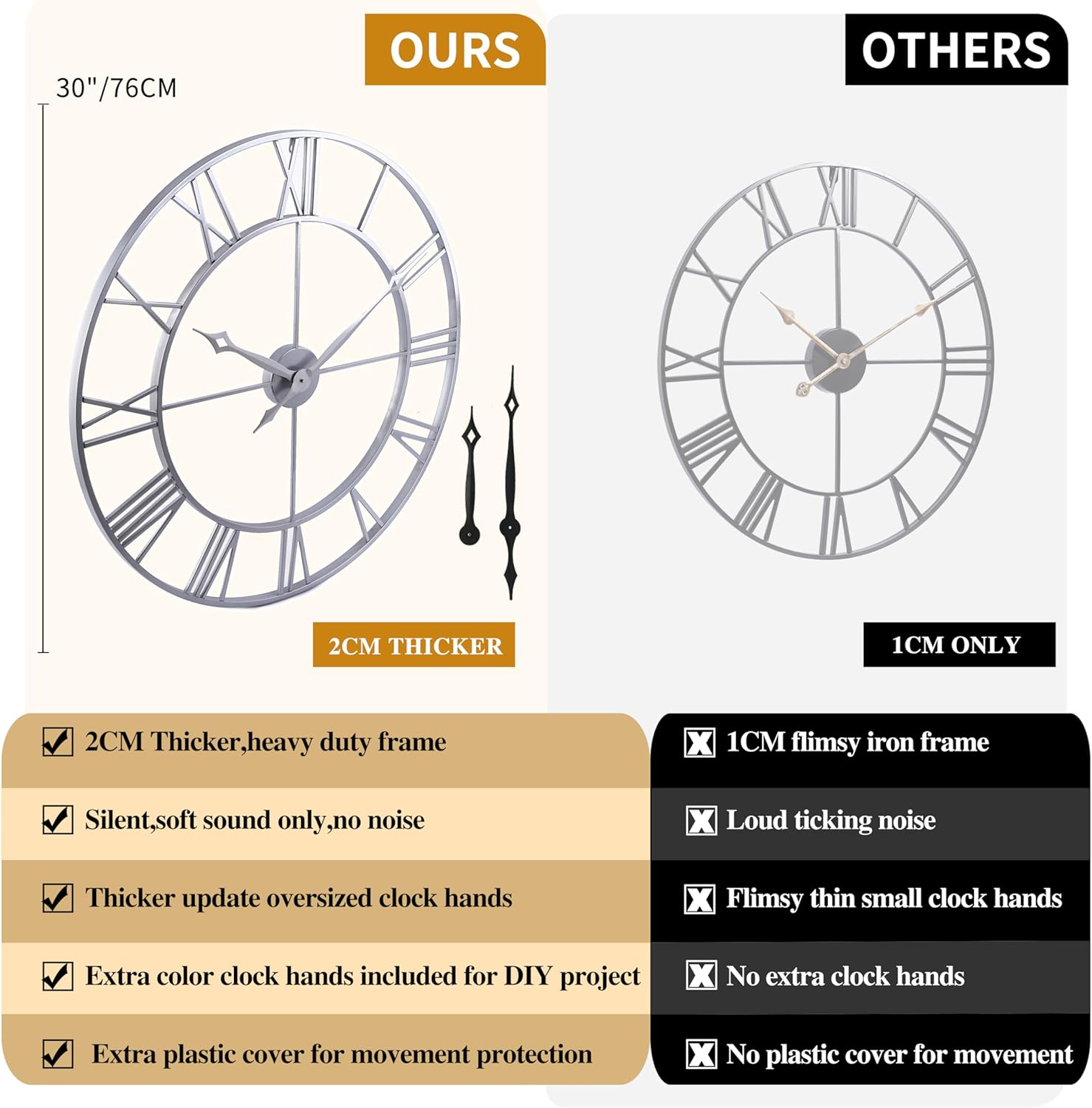 - [Easy to Read and Hang]-30" (75cm) Oversized large Roman numerals in contrast with aluminum large hands for easily reading. Simple design with a good performance. Package Comes with 1 set extra black color interchangeable Clock HandsïŒalso included Invisible Nail Hangers for hanging