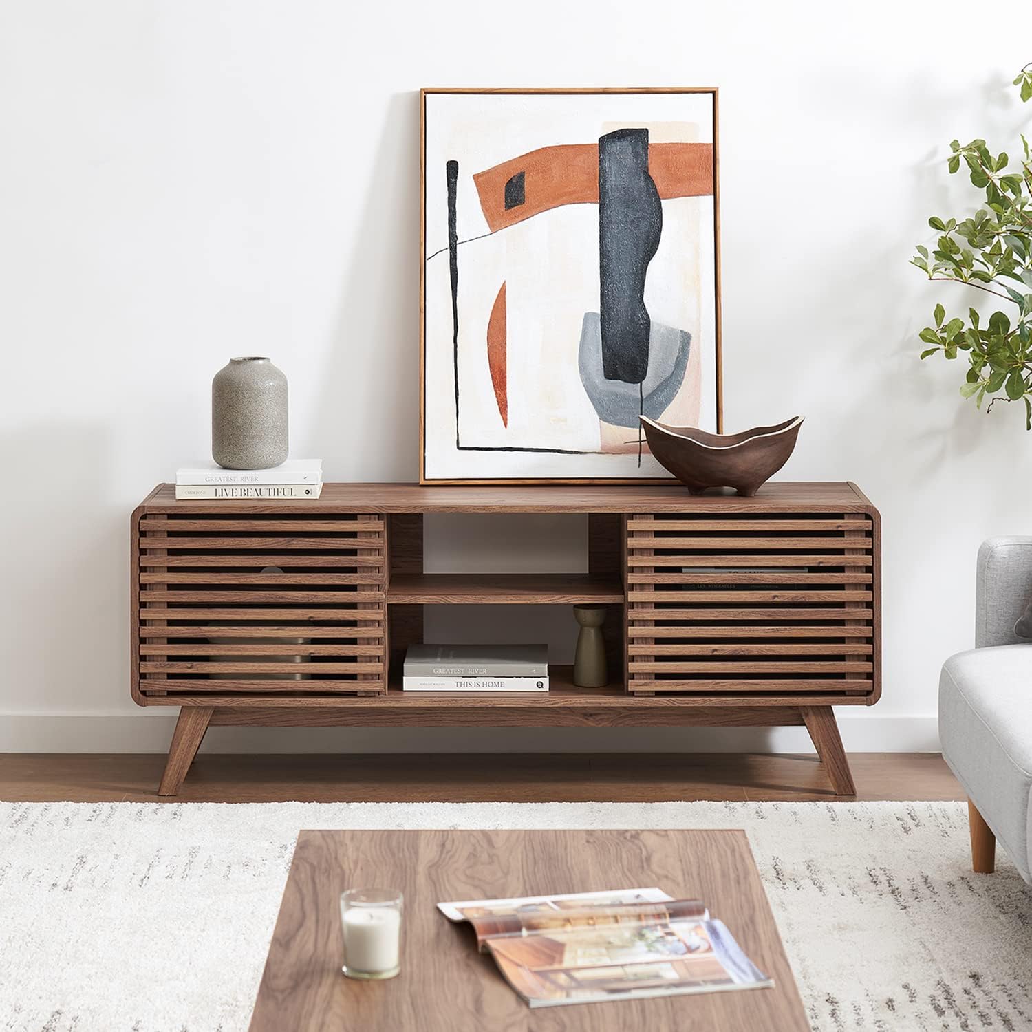 - Design: Mid-century modern TV stand with slatted door design and adjustable shelves. Multiple storage spaces for your consoles