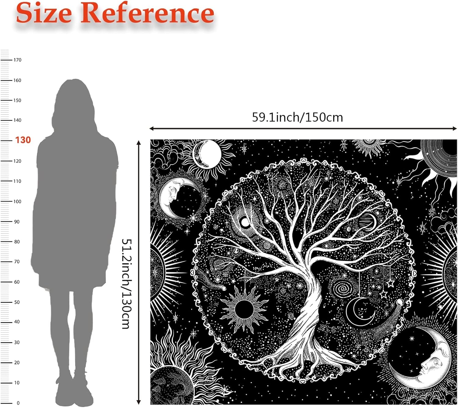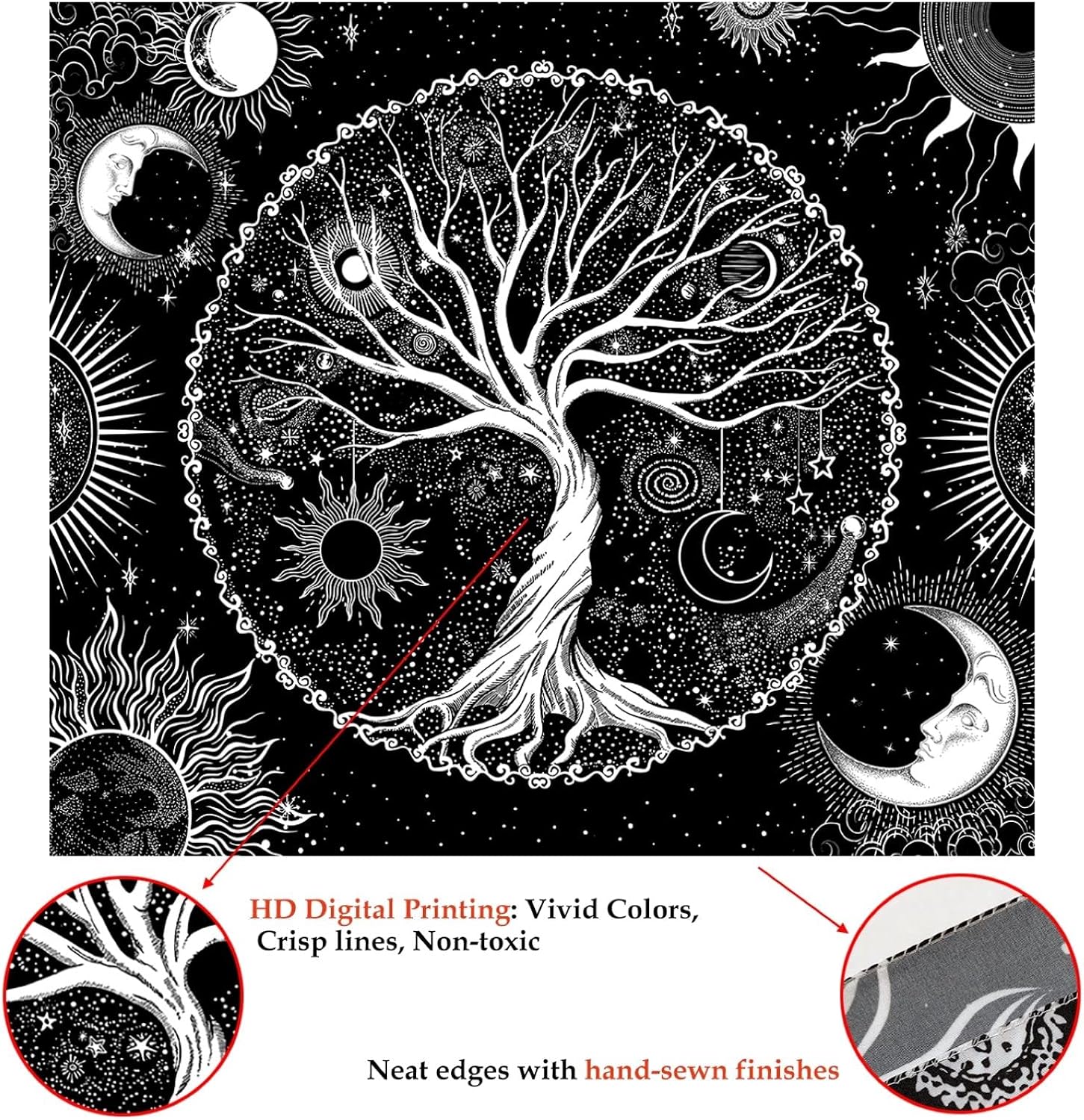 - This wall tapestry is unique design with tree, sun, moon, stars, and galaxy space elements. It's made from high quality polyester fabric, which is skin-friendly, soft, lightweight, durable, and has no peculiar smell