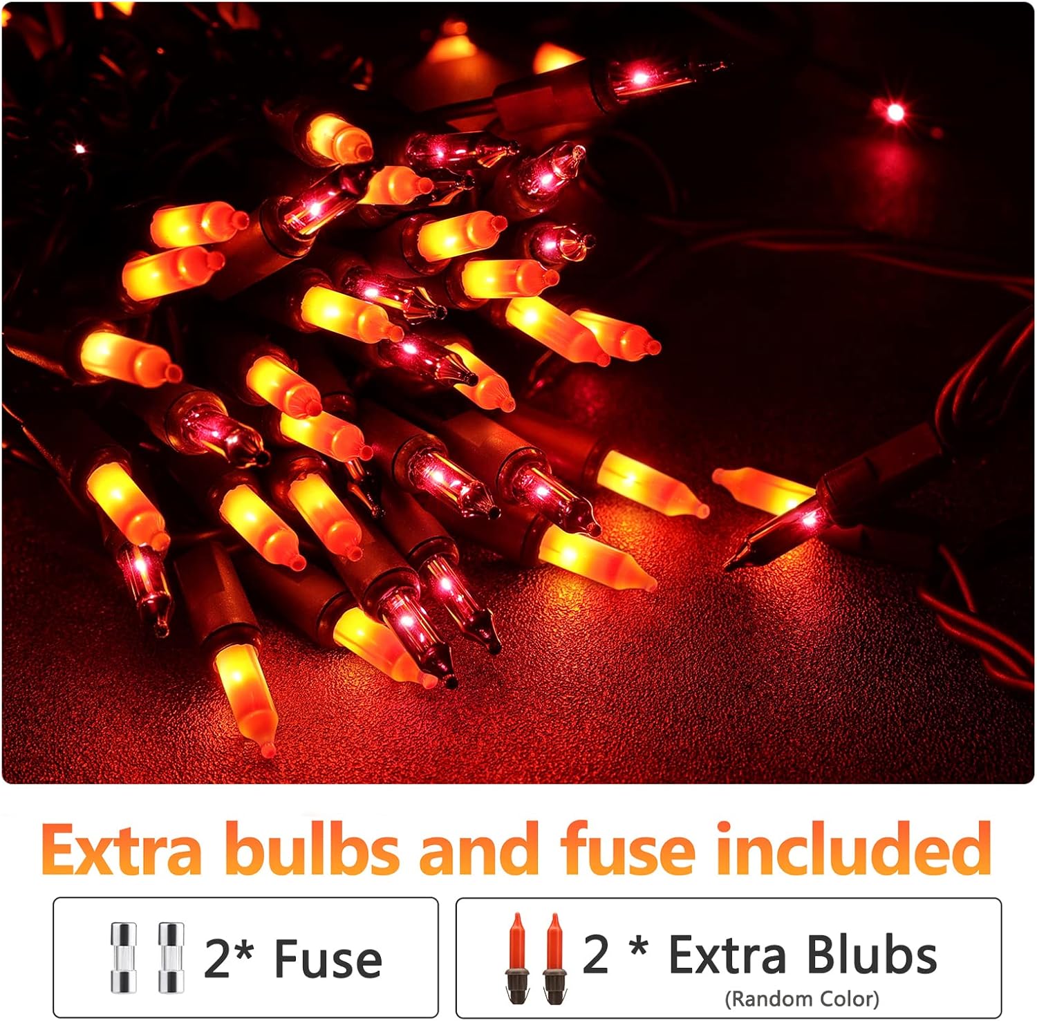 - 100-Count Incandescent Orange & Purple Halloween String Lights: 100 counts per string with bulb space 2.4in, 1.2V, and 0.41W per bulb, built-in 3A fuse for safety use. Extra bulbs and fuses included.