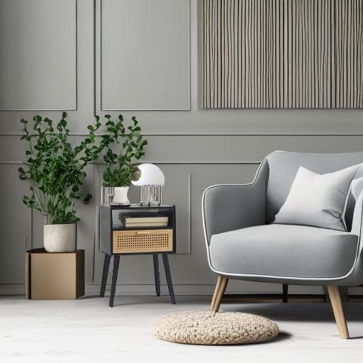 MaxSmeo End Table with Storage Mid Century Nightstand with Rattan Drawer and Shelf, Wood Small Side Coffee Table for Small Space, Living Room and Bedroom, Easy Assembly (Black)