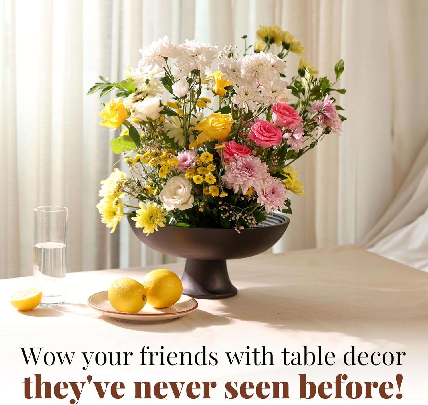 - SIZE: 12 inch in diameter and 5 inch height, this black fruit bowl or footed bowl can accommodate a variety of healthy snack choices like fruits, vegetables, nuts, breads and even special treats like candy. Our fruit bowl can easily hold upto 10-12 apples. This large fruit bowl is thus perfect for table tops, table decorations centerpieces and family gatherings.
