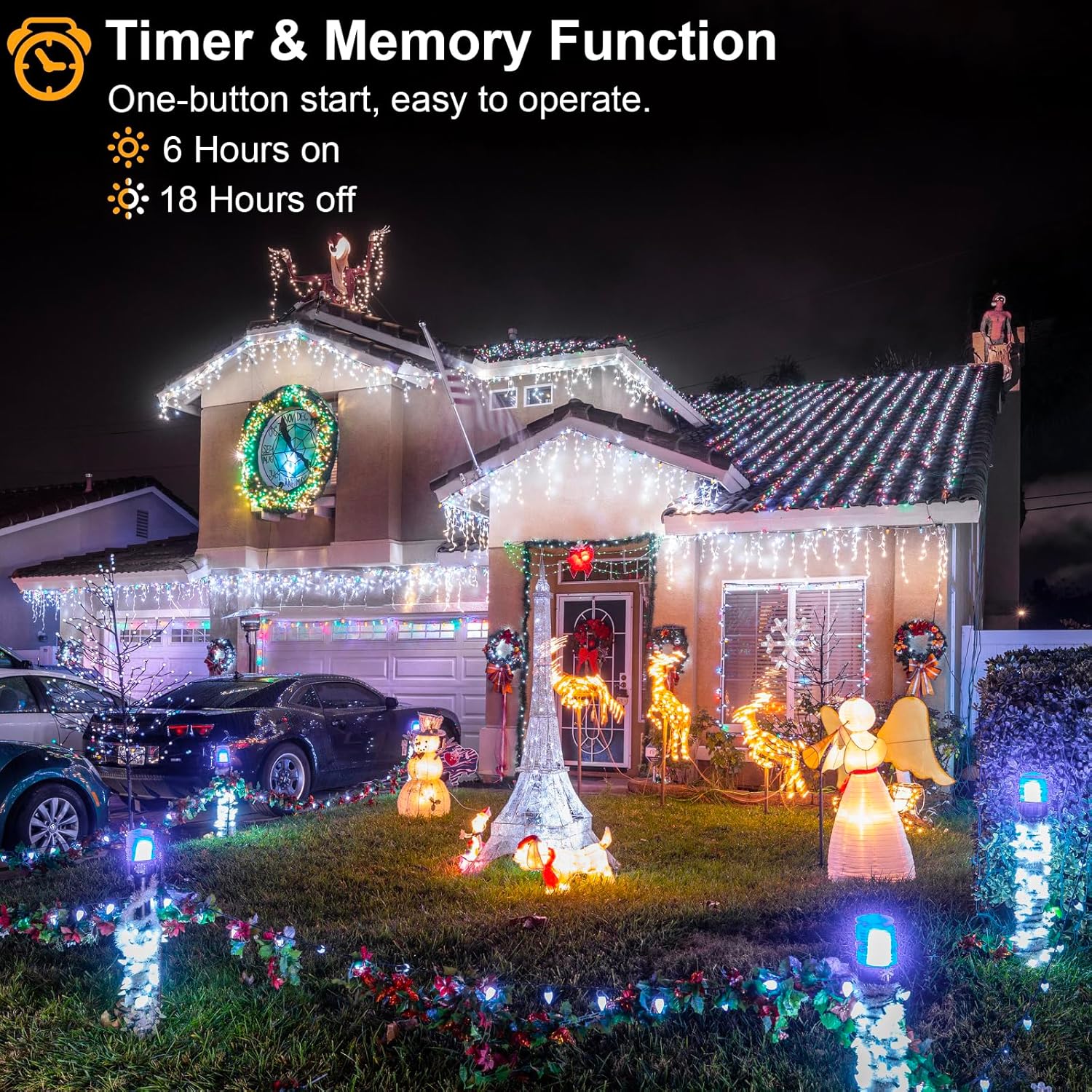 - [LED Icicle Christmas Lights] 640 LED Christmas lights totally length is 76ft, including 66ft icicle lights and 10ft extension cord. The icicle Christmas lights can be connected up to 2 sets to decorate larger areas, suitable for use throughout the year - birthdays, anniversaries, Christmas decoration. The connectable icicle lights can be controlled by one button on the power adapter. Hang these string lights outdoor indoor to create warm and romantic atmosphere for you.