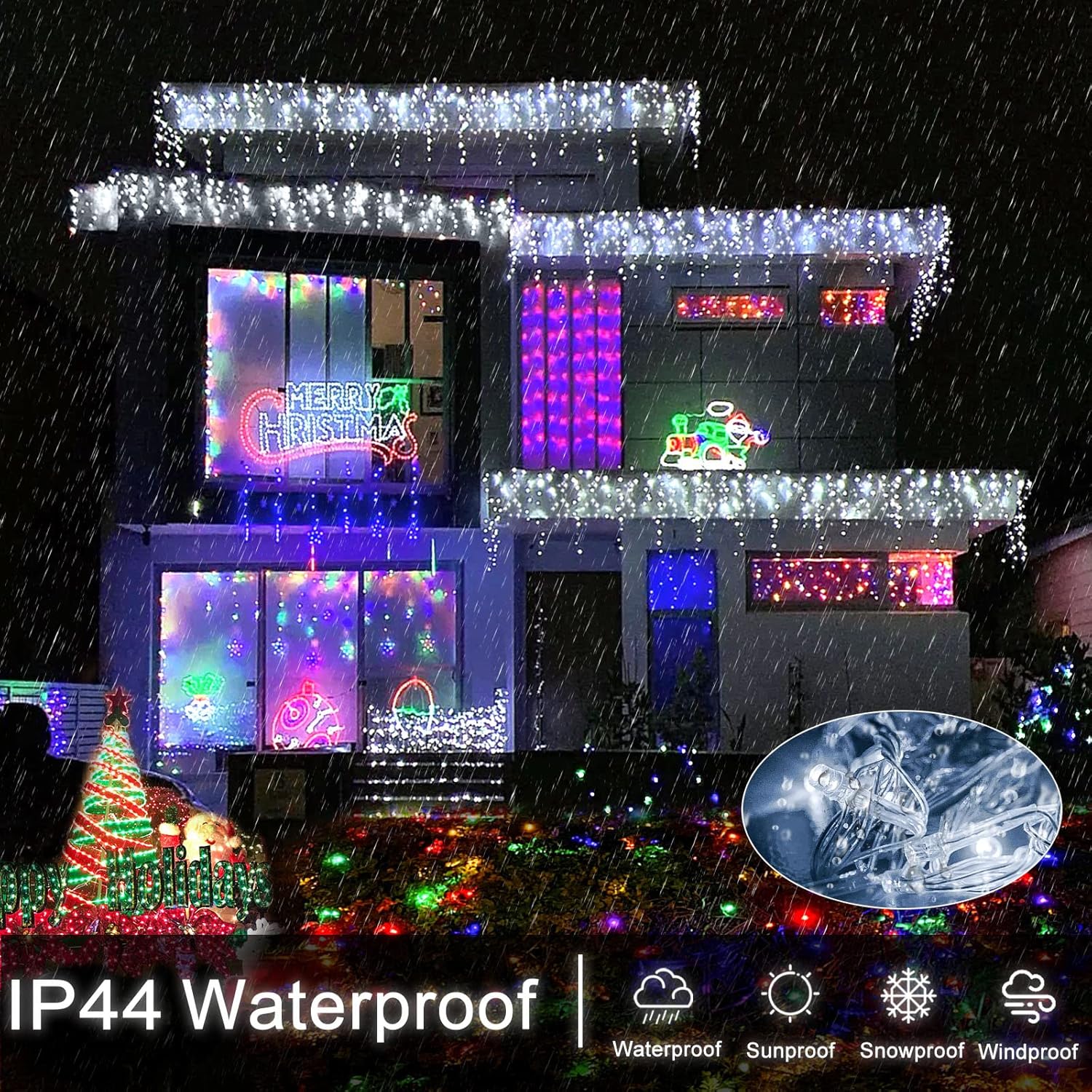 - [Waterproof&UL certified] The icicle lights are IP44 waterproof, which is perfect for outside decoration and can work normally even in wind, rain, freezing rain, heavy snow and freezing cold temperatures. These Christmas lights has approved UL Certification, output voltage is 29V, it's completely safe to touch. These led icicle lights are made of 100% premium copper wire and will not overheat even after prolonged use.
