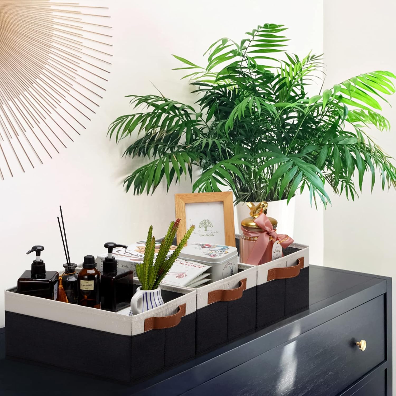 GhvyenntteS Storage Baskets for Shelves 12 Pack, Fabric Storage Bins with Leather Handles, Foldable Rectangular Storage Baskets for Organizing Home, Office (Black/White, 11.8" x 7.87" x 5.11")
