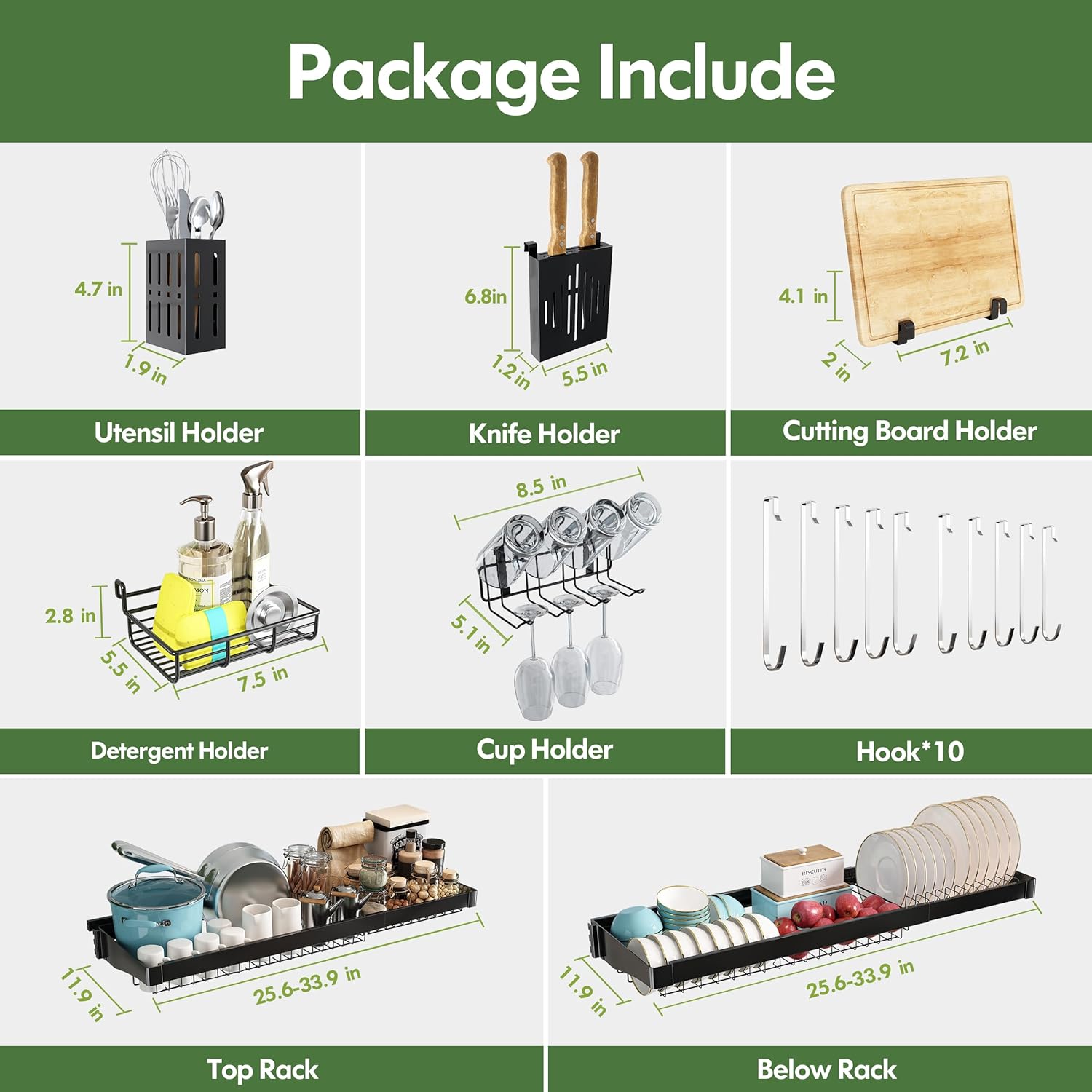 - 🧺 Multi Level Storage Efficiency: Three spacious tiers organize dishes by type, large cookwares on top, bowls and plates in the middle, while dedicated sponge holder and hanging hooks keep sponges and brushes accessible. The dish rack over sink open grid design accelerates drying by promoting airflow, reducing water spots