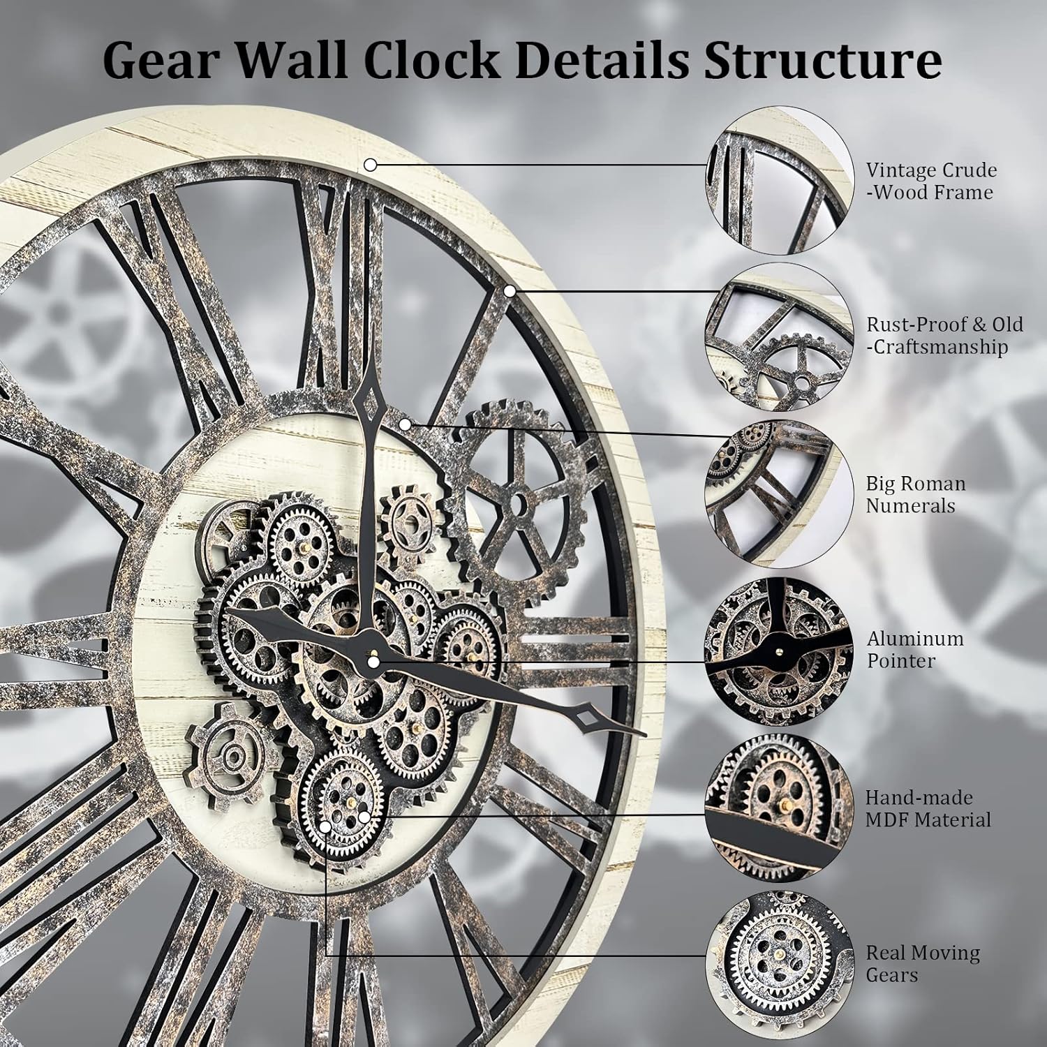 - ăReal Moving Gear ClockăAll gears for the wall clock are real moving! Design with rustic bronze-color and industrial style. An creative combination of four gears for a retro look, has a very exquisite decorative effect makes the wall clock become a chic art works. The large wall clock crafted of nature wood & MDF. Big roman numeral numbers and wood rustic moving gears perfect for any room decor.