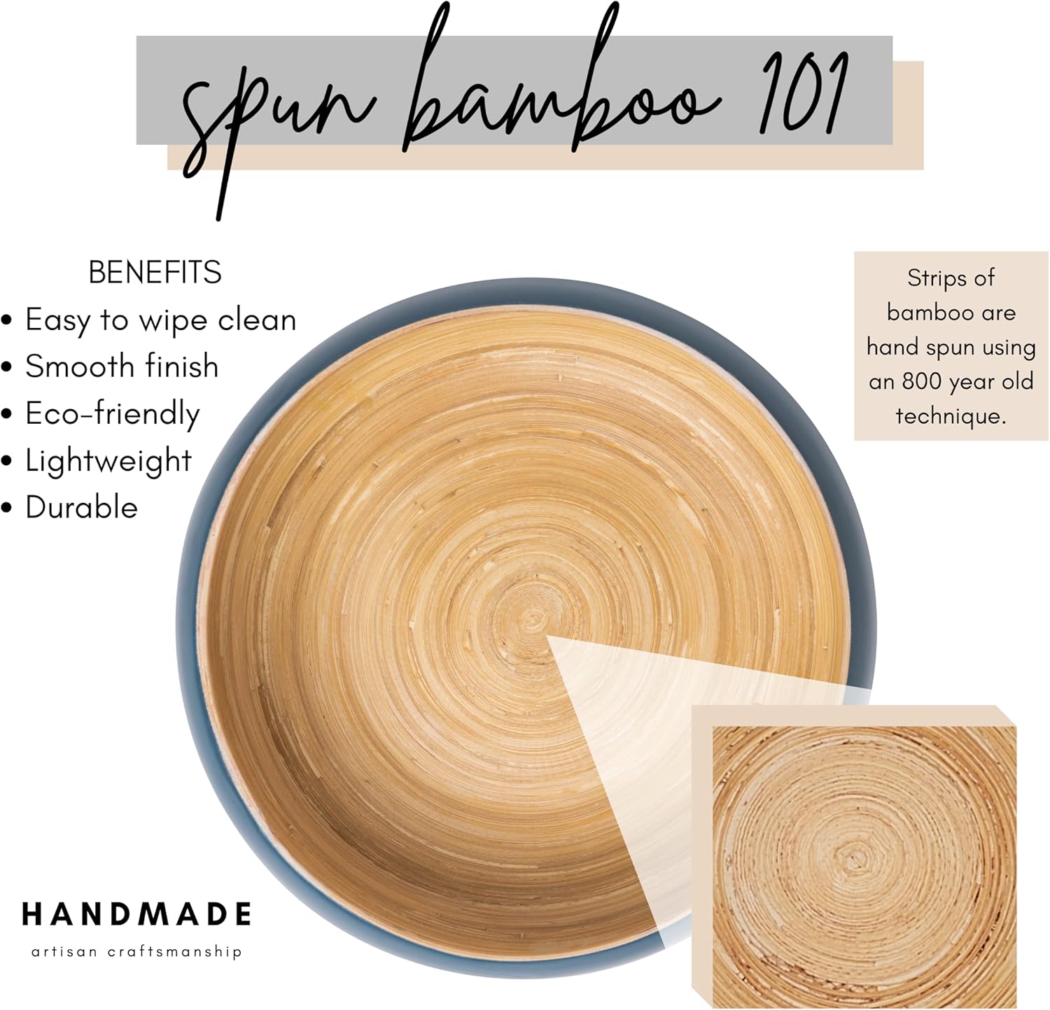 - Add the warmth of handmade, natural materials to your home while keeping a modern, sleek look and feel with this spun bamboo bowl, whether you need a fruit bowl for kitchen counter, decorative bowl for the living room, or centerpiece for the dining table.