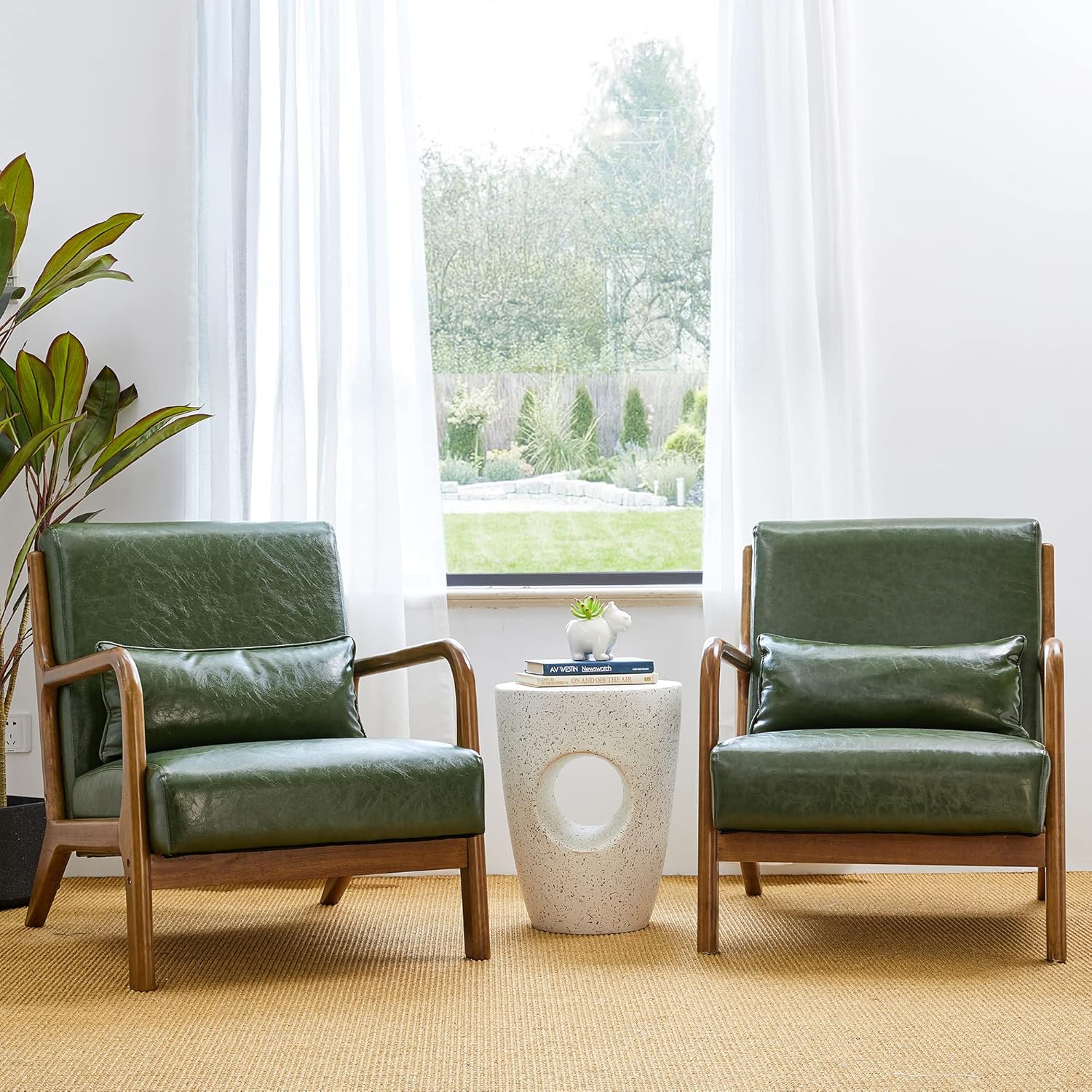 Glitzhome 2 Set Mid Century Hunter Green Accent Armchair, Single Reading Armchair PU Leather Lounge Chair with Walnut Ruberwood Frame
