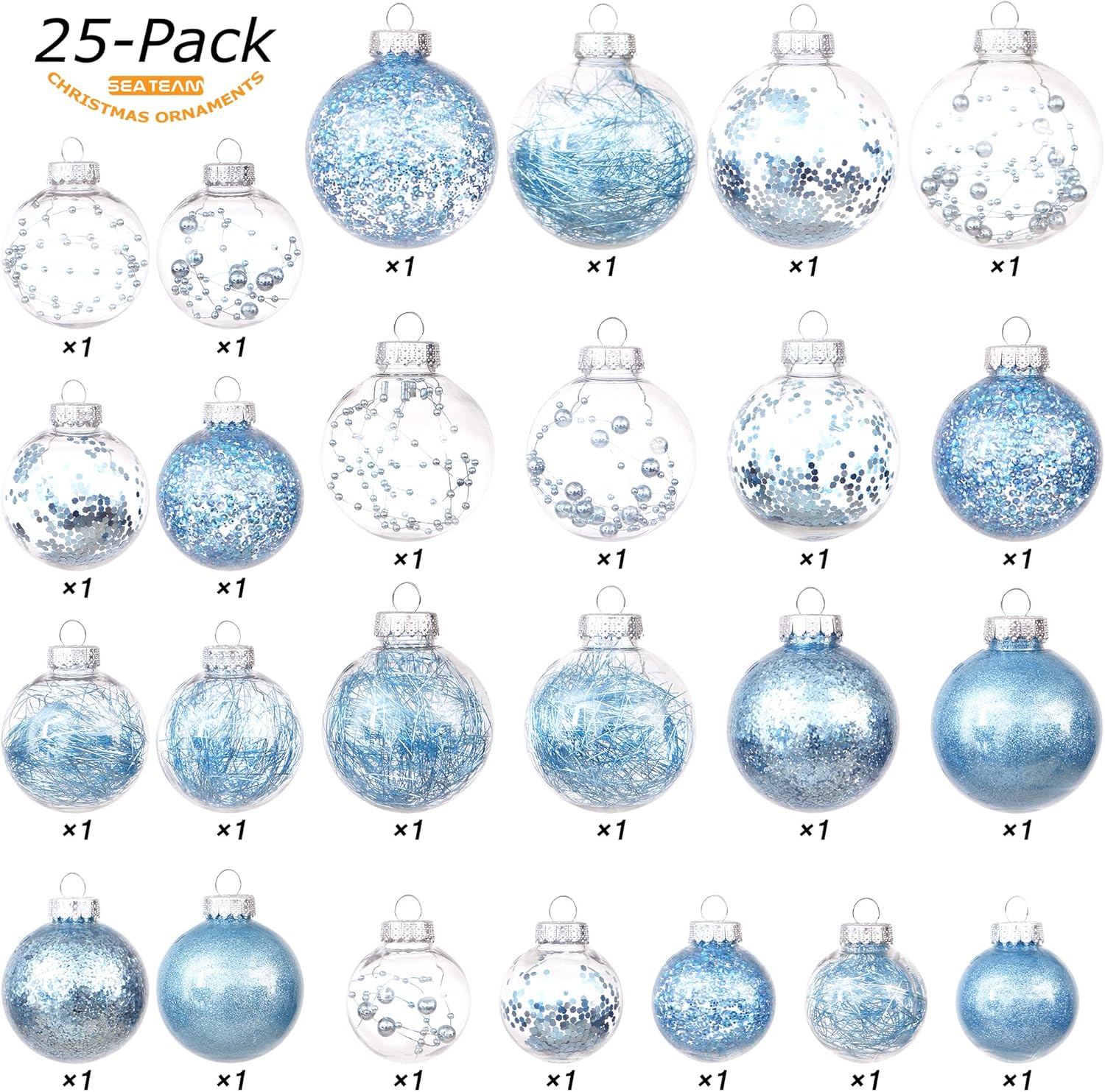 Sea Team Christmas Baubles Set Clear Plastic Shatterproof Multi-Size Decorative Christmas Baubles with Stuffed Delicate Decorations (25 Pieces, Babyblue)