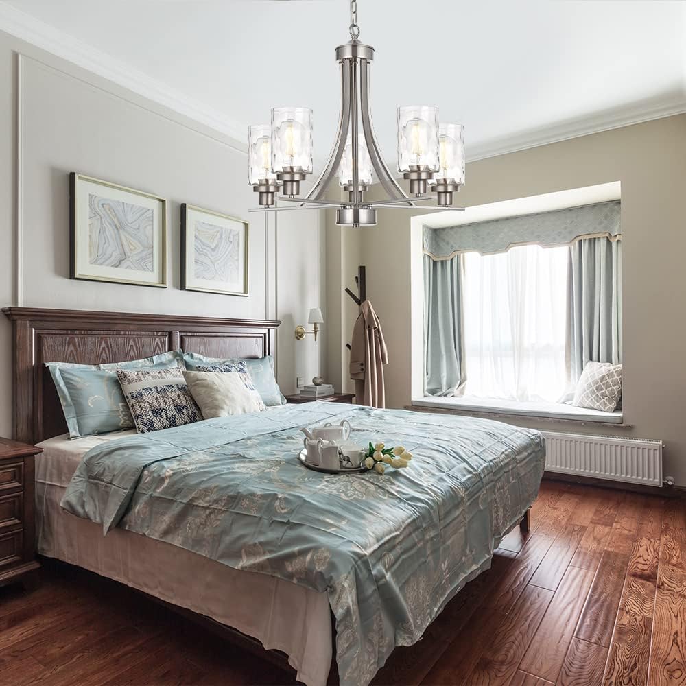 - ๐5 Light Glass Chandelier: This contemporary chandelier with high clear glass shades๏ผit is an elegant update for traditional and modern homes alike.It's the perfect light fixture to install in kitchen, island, dining room,living room,foyers ,hallway,bedroom,coffee bar, lobby, restaurant and any space you like.