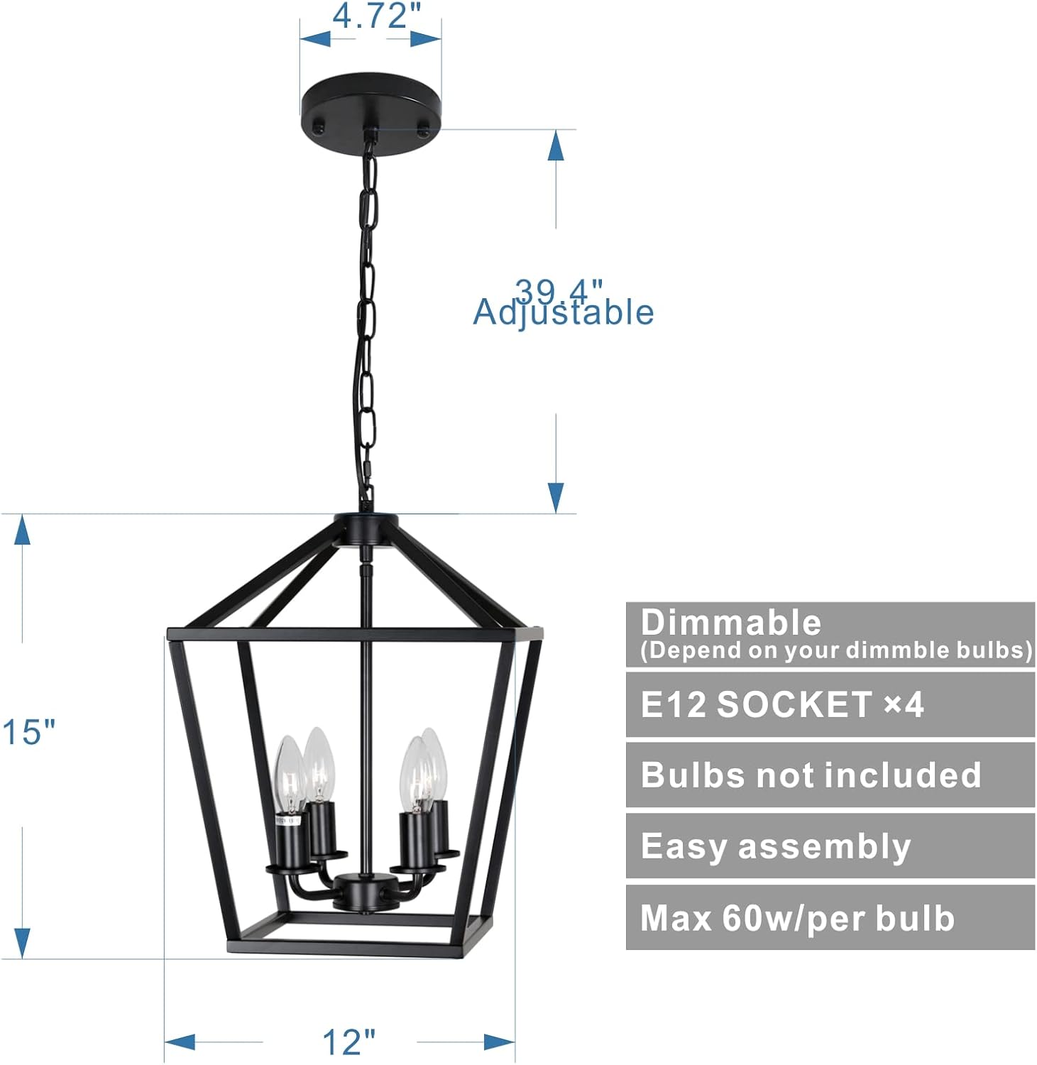 - 【Application】The Lantern chandelier dimension is 12"×12"×15",chain length:39.4",the chandelier light chain height is adjustable, and it can be installed on sloped or flat ceilings.