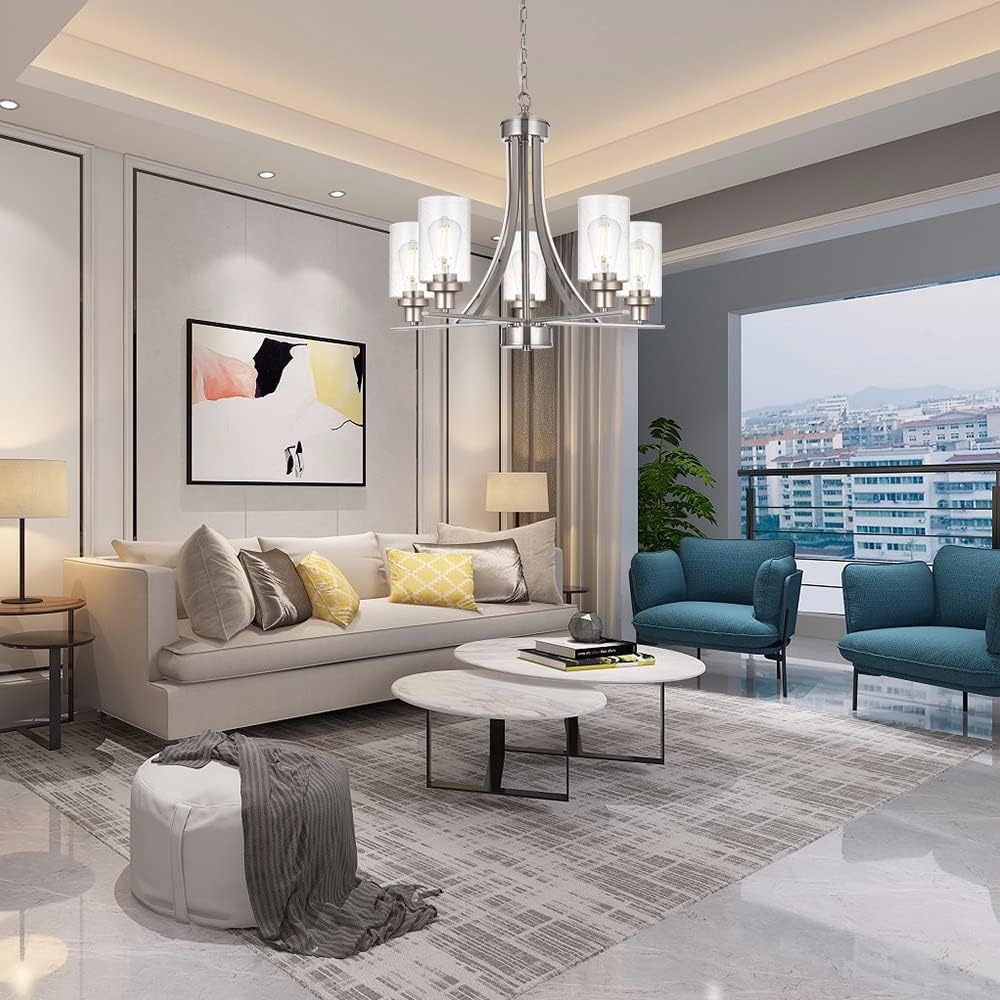 - 💎 Adjustable : Chandelier: 20" (H) x 22.5" (D). Clear Glass Shades: 6" (H) x 4" (D).Canopy: 5.11" (D) , includes 57" of adjustable chain,you can adjust the hanging height as per your request.