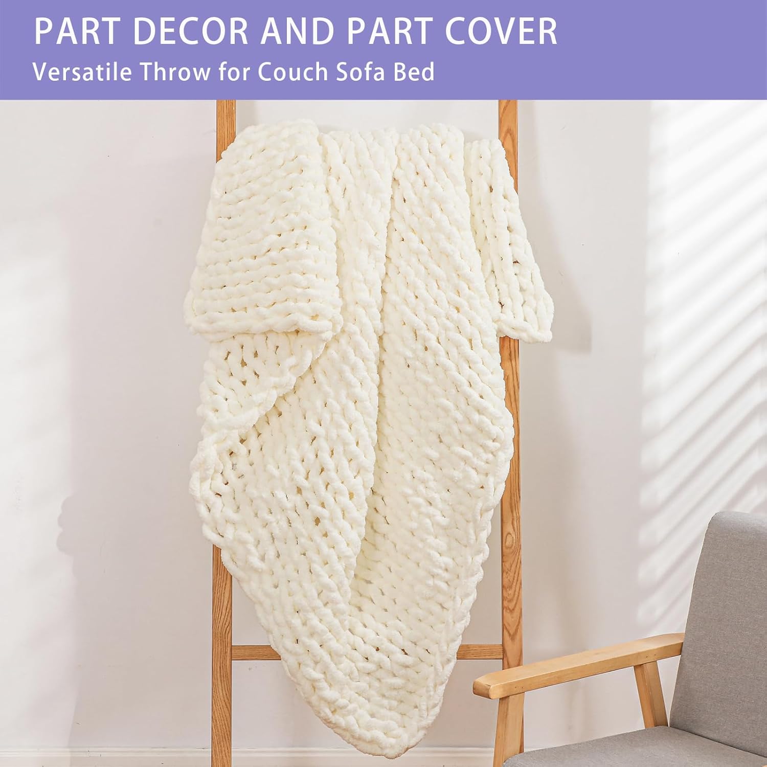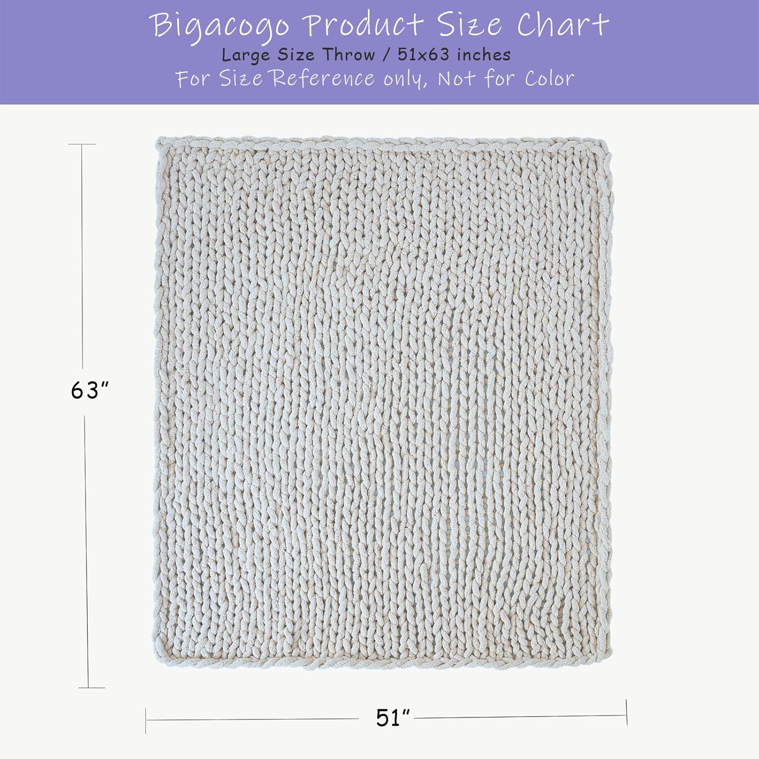 Bigacogo Chunky Knit Throw Blanket for Couch, 51x63 inches, 100% Hand Knitted with Thick Jumbo Chenille Yarn, Cozy Soft Large Rope Knot Cable Crochet Blankets for Sofa Bed Living Room, Ivory