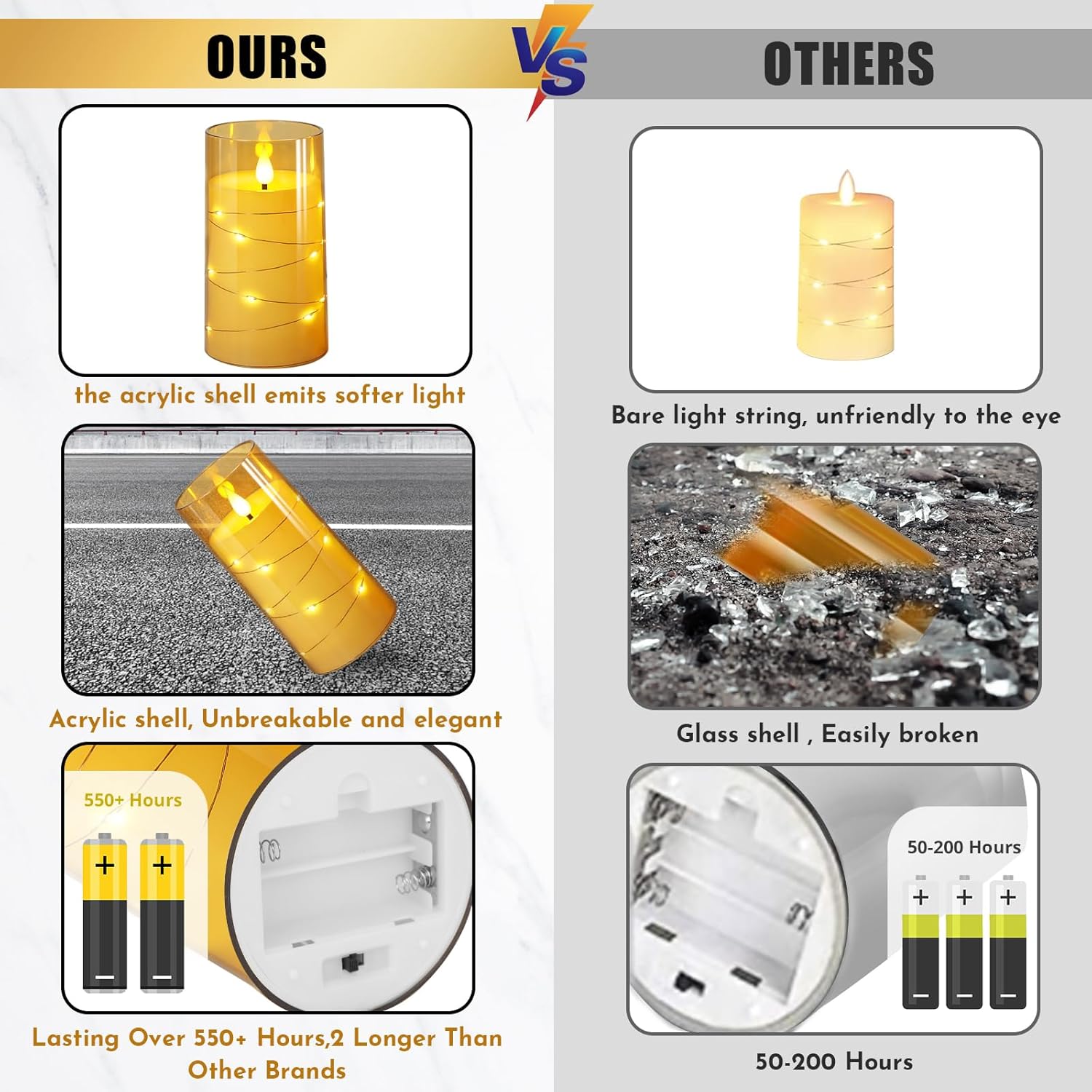 - 【Unbreakable Material, Realistic Appearance】flameless candles are made of high quality acrylic. Compared with glass radiance candles, acrylic shells make the battery candles stronger and lighter. Through the clear shell, you can see the real flame effect