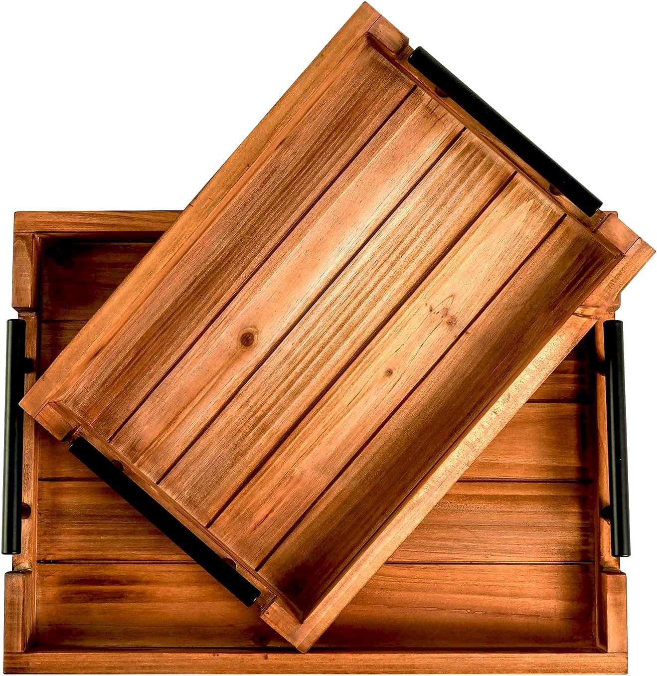 Set of 2 Decorative Nested Wood Vintage Serving Tray with Black Stainless Steel Handles for Eating, Breakfast in Bed,Kitchen,Ottoman Trays, Coffee Table Trays Farmhouse Tray