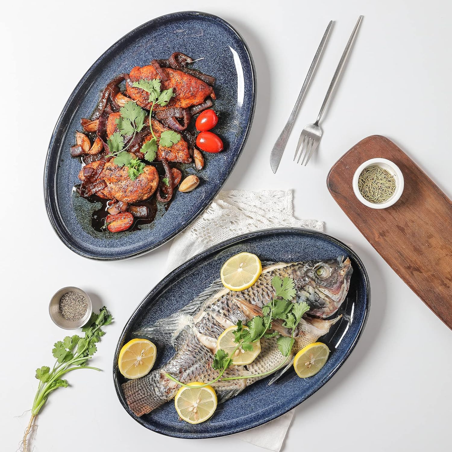 - LARGE LONG PLATTER: Our oval serving plates are 14.5 Inch long and easily stackable, the oversized fancy serving dishes are elegant and perfect for serving meat, turkey, roast chicken, steak, fish, sushi, dessert, fruit, salad and bread