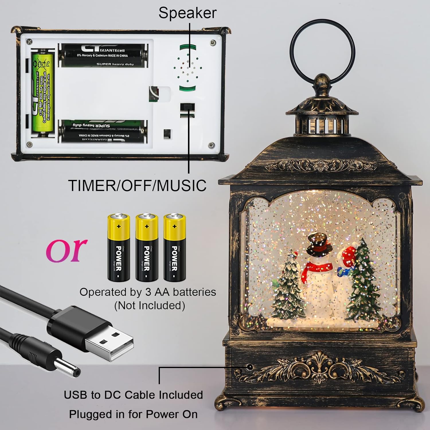 - PACKAGE LIST: You will get 1 pcs Snowman Snow Globe Lantern with Timer, 3 AA batteries( not included). Product dimension is 9.6" x 4.6" x 3.1".