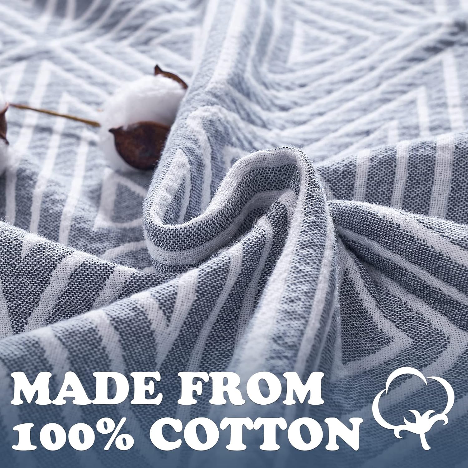 jinchan Boho 100% Cotton Blanket Muslin 50x60 Inches Lightweight 3-Layer Geometric Triangle Striped Pattern Reversible Quilt Throw Soft Breathable Comfy All Seasons for Couch Bed Decor, Blue