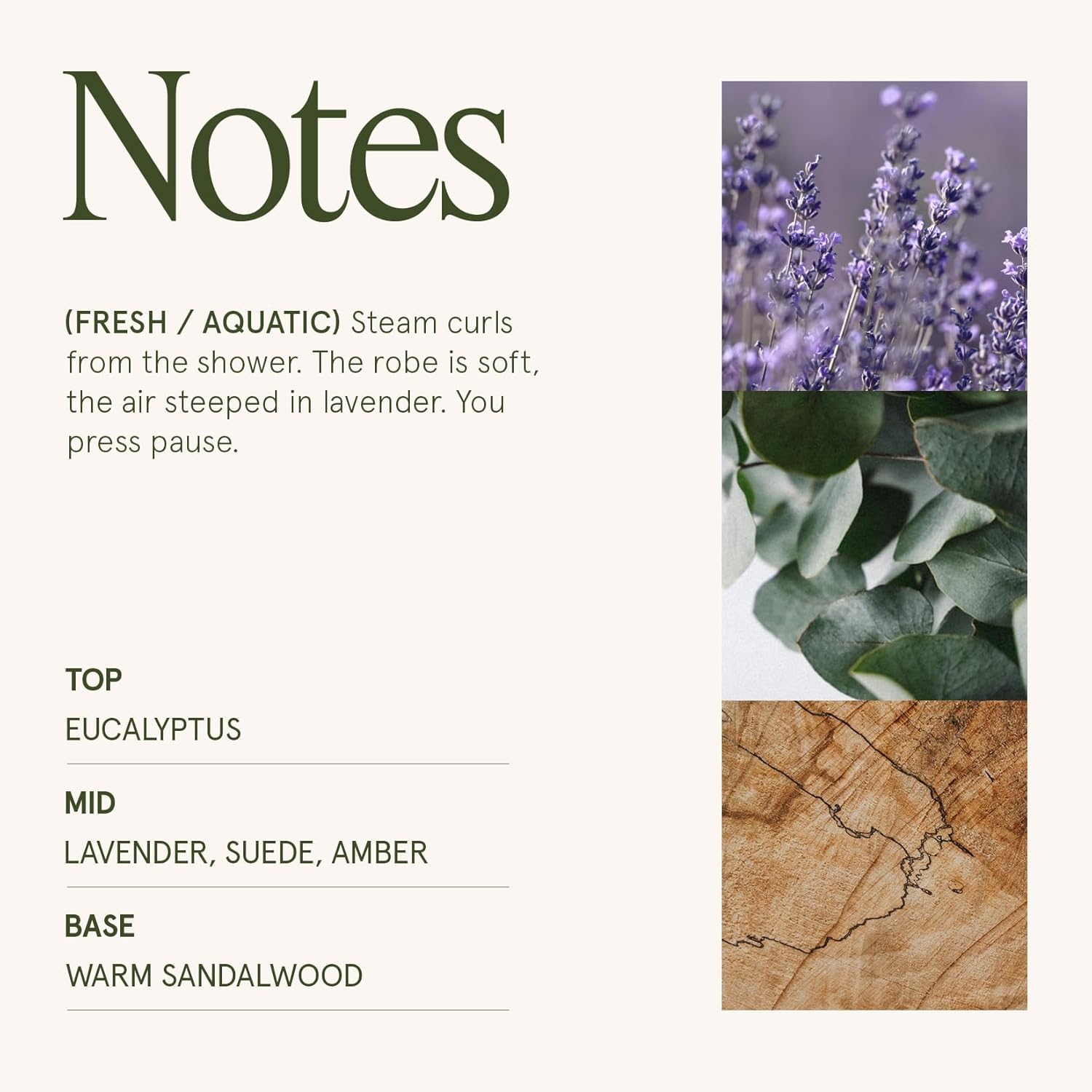 - LAVENDER SUEDE: A harmonious blend of invigorating eucalyptus, sweet orange, and aromatic pine leads to a heart of soothing lavender, velvety suede, and rich amber, ultimately settling into a cozy base of sweet coumarin, creamy vanilla, and warm sandalwood in this enchanting fragrance.