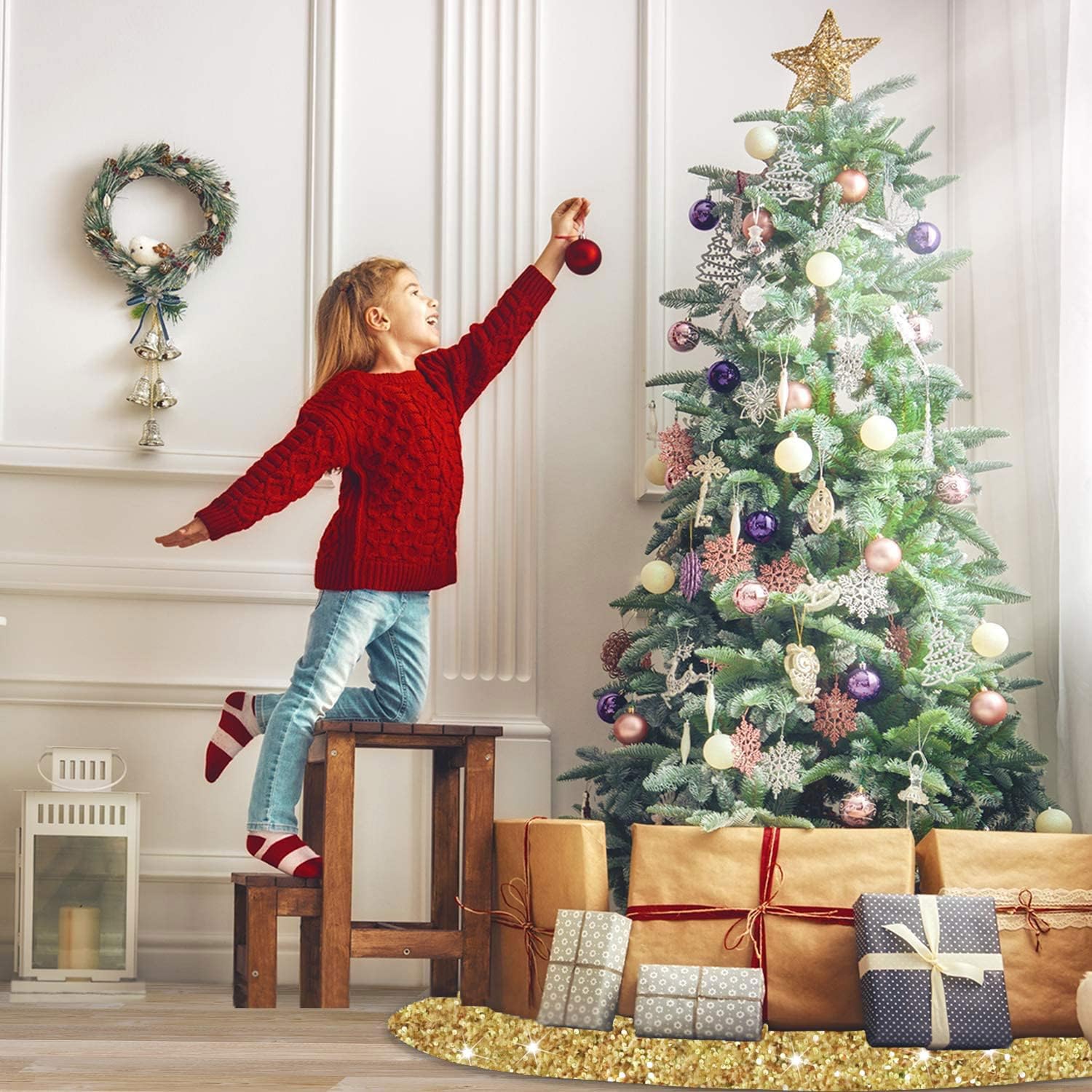 - âď¸ăSize Detail - Sequins Christmas Tree SkirtăYou will receive a 36 inches diameter gold glitter sequins tree skirt, fits under 3 foot tall trees. You can put some gifts, Christmas boxes, Christmas ball on the xmas tree cover mat. The sparkle velour Christmas tree skirts is perfect for decorating your home and become part of your holiday tradition.