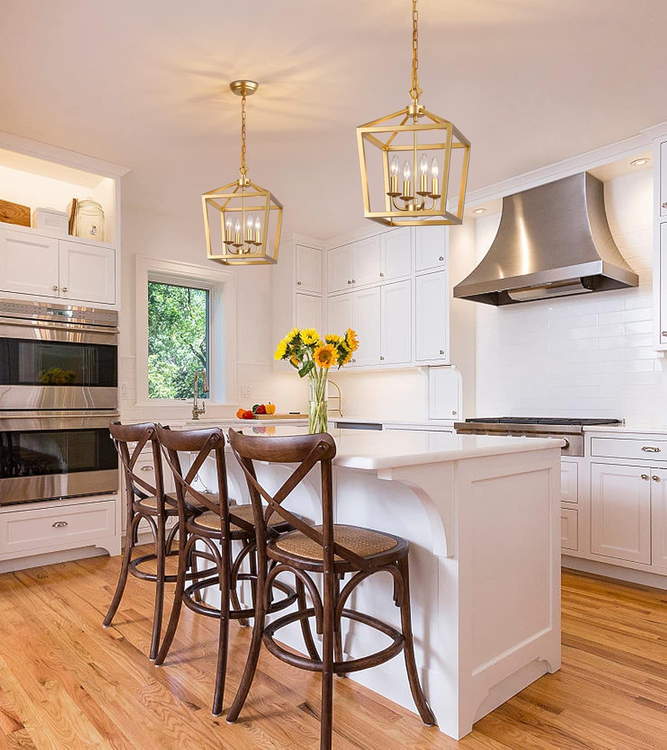 - Easy to Assembly:The gold kitchen lantern pendant light is easy to install,this modern chandelier with adjustable chain,you can adjust the length of the chain according to the height you want,also with detailed installtion instruction manual.It can be install for a sloped,flat,vaulted ceilings.