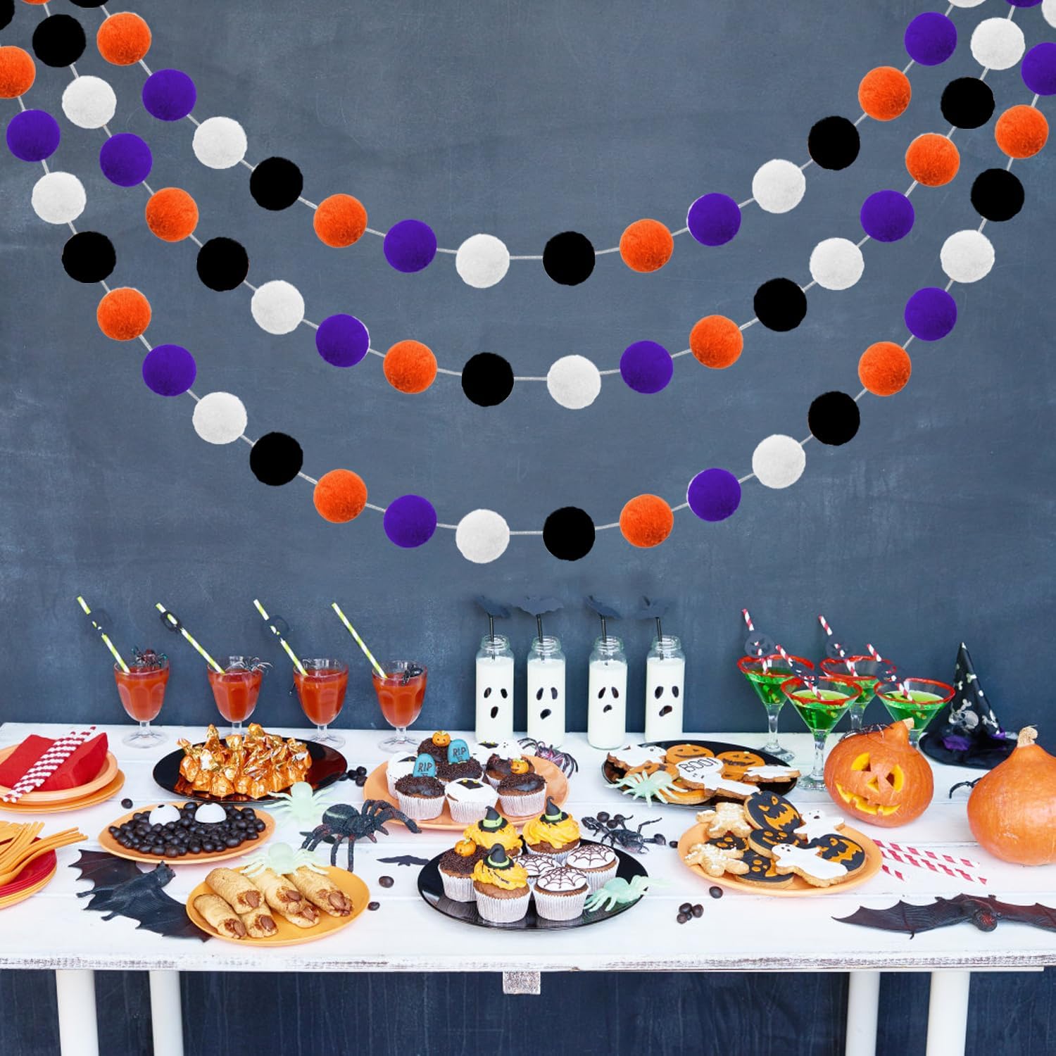 - HALLOWEEN DECORATIONS FALL POM POM GARLAND PACK OF 3: Each pom pom Garland contains 24 pom pom balls, the felt ball garland is 6.6 feet/ 2m long and the pom pom ball is 25mm in diameter, no knot on the string of the garland, so the distance between balls and total length are all adjustable. Jishi 3-pack elegant cute Halloween garland strand set can meet your Halloween, Fall, birthday and parties decoration needs. NOTE: Winding Risk May Exist, Please Stay Away From Children Under 3 Years Old.
