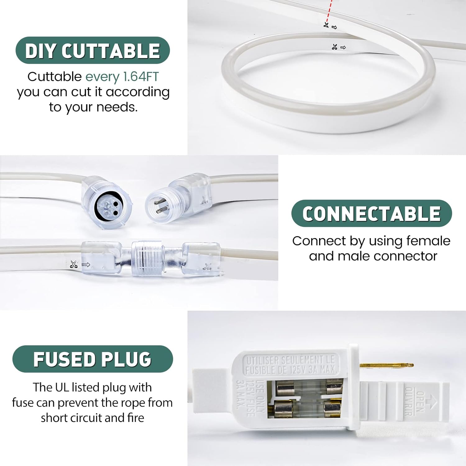 - Cuttable & Connectable--GZBtech AC 110-120V LED neon rope light can be cut in every 20inches/0.5m along the cutting marks, you can cut it according to your needs. By using male and female end-to-end for easy connection,plug and play without wiring. This is a 0.31''(W)x0.63" (H) heavy-duty rope light. If you need a smaller neon strip with higher lumens, please click visit the store on the top of this page to view it.