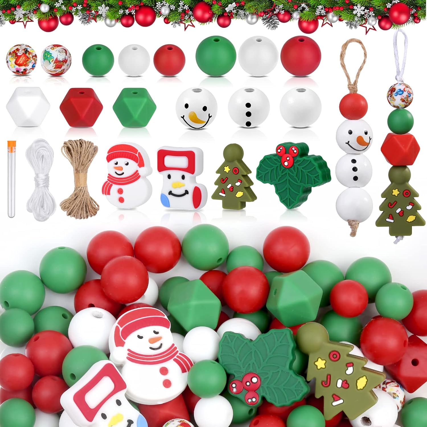 - ๐๐ก๐ซ๐ข๐ฌ๐ญ๐ฆ๐๐ฌ ๐๐๐๐๐ฌ ๐๐ฎ๐ฅ๐ค ๐๐จ๐ซ ๐๐๐๐จ๐ซ Lucomb silicone beads contain 12mm 15mm of round rubber beads with 3 different colors (white, red, green), 14mm polygon silicone beads, 16mm white wooden beads, Christmas stocking shape, Snowman, Christmas tree, Leaves-shape silicone spacer beads, ropes, big eye beading needles. All the color of beads is classic and rustic, string these all up may be making garland lanyard and tassels or decorating somewhere in the house for Christmas Decoration.