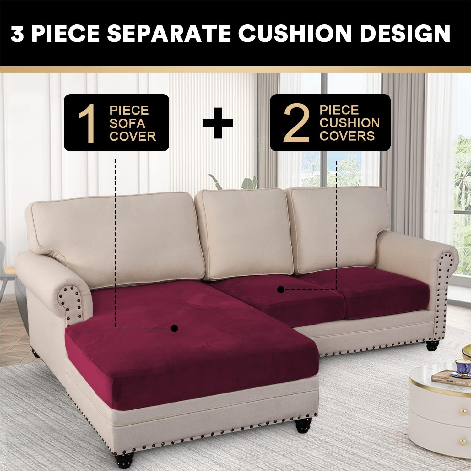 PrinceDeco Sectional Couch Covers 3 Pieces Velvet Sofa Covers L Shape Soft Couch Covers for Sectional Sofa Corner Sofa Cover Couch Cover for Dogs Washable (2 Seater + 1 Chaise,Burgundy)