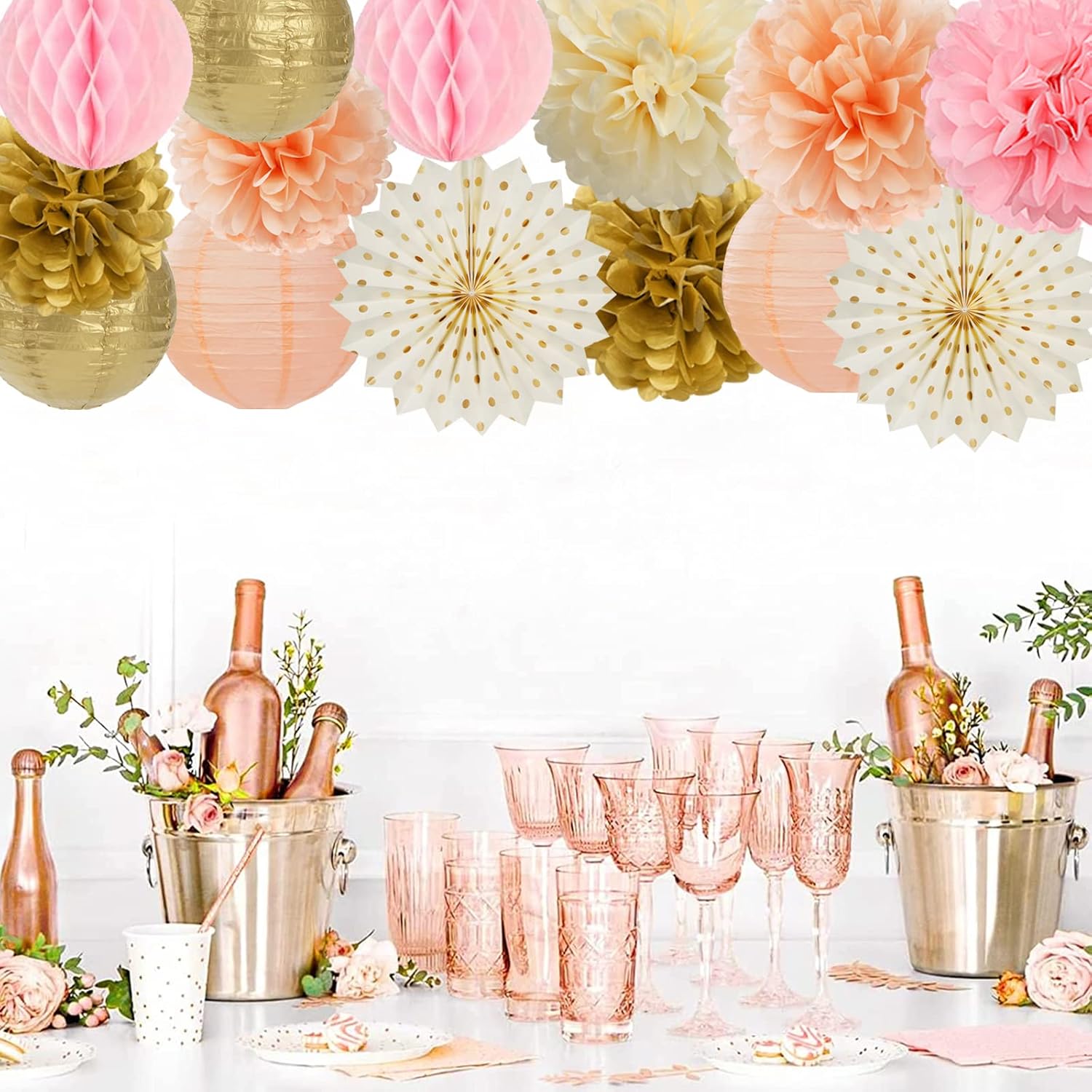- Pink Peach Gold Party Kits】The party decorations kits include 6pcs tissue paper flowers: 3pcs 10" and 3pcs 12" in three color, 4pcs 8inch paper honeycom ball,2pcs 8inch paper lantern, 2pcs 12inch paper fan.
