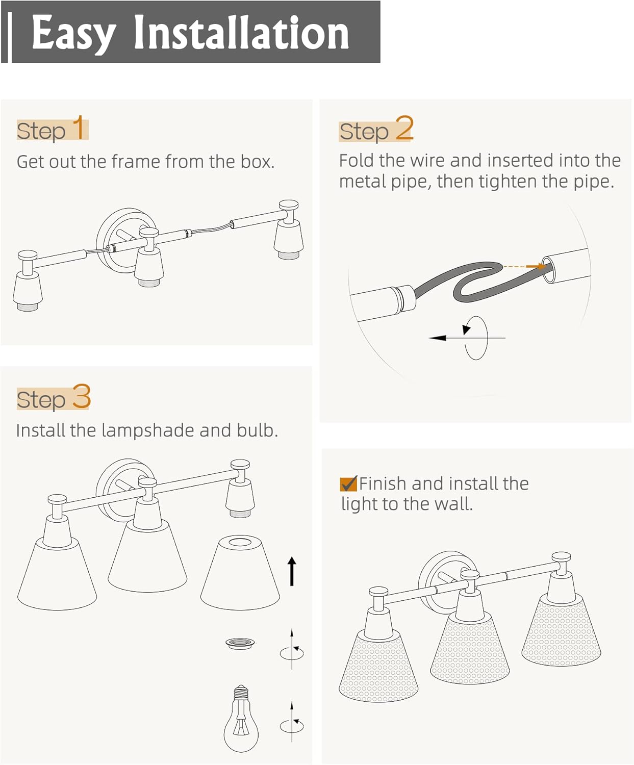 - 【Bulb Requirements】Support any E26 base bulbs ( Max 60W/each, bulbs are not included). This bathroom vanity light is also designed to be dimmable when used with a dimmable bulb and compatible dimmer switch.