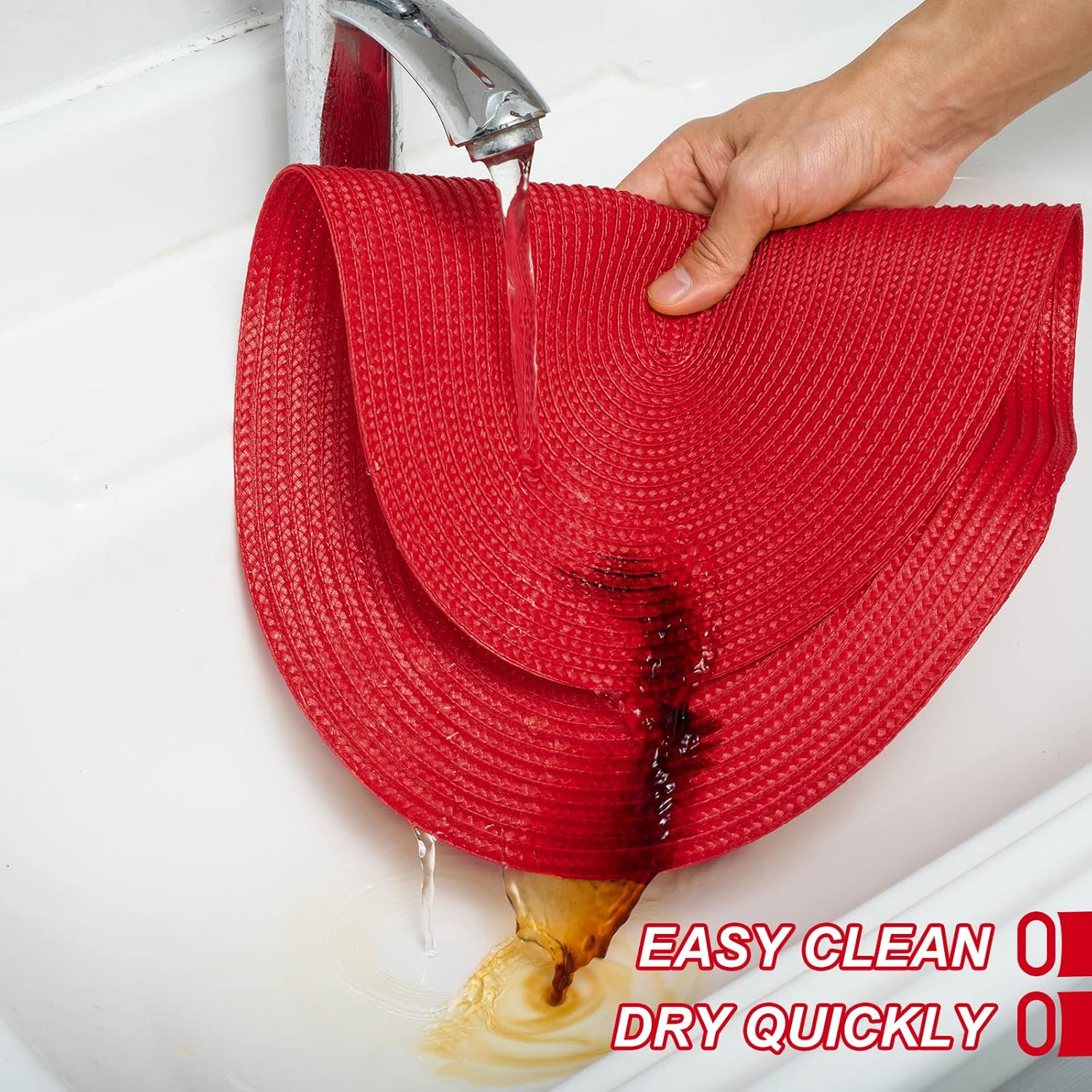 - Easy to clean: washable by hand. If stain on it, clean it with soft brush. Natural drying is recommended, you can roll up to store away, placemats will be flat when put out to use.