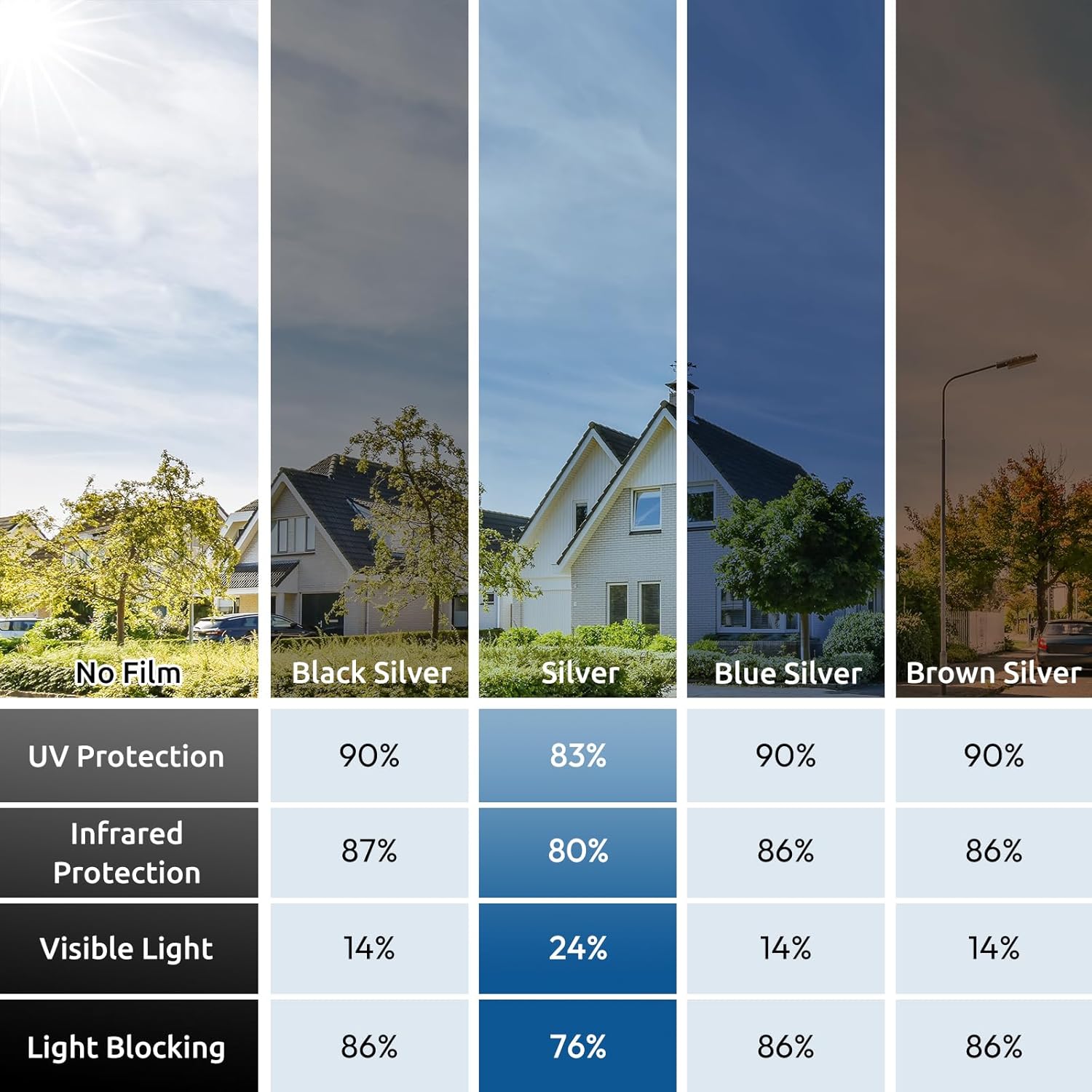- UV Protection, Glare Reduction: Blocks up to 83% of UV rays, this window film heat blocking helps protect flooring, furniture, and draperies from fading. It also protects your eyes and skin from harmful UV rays. With 24% VLT, it effectively reduces glare while allowing some visible light in, creating a comfortable indoor environment