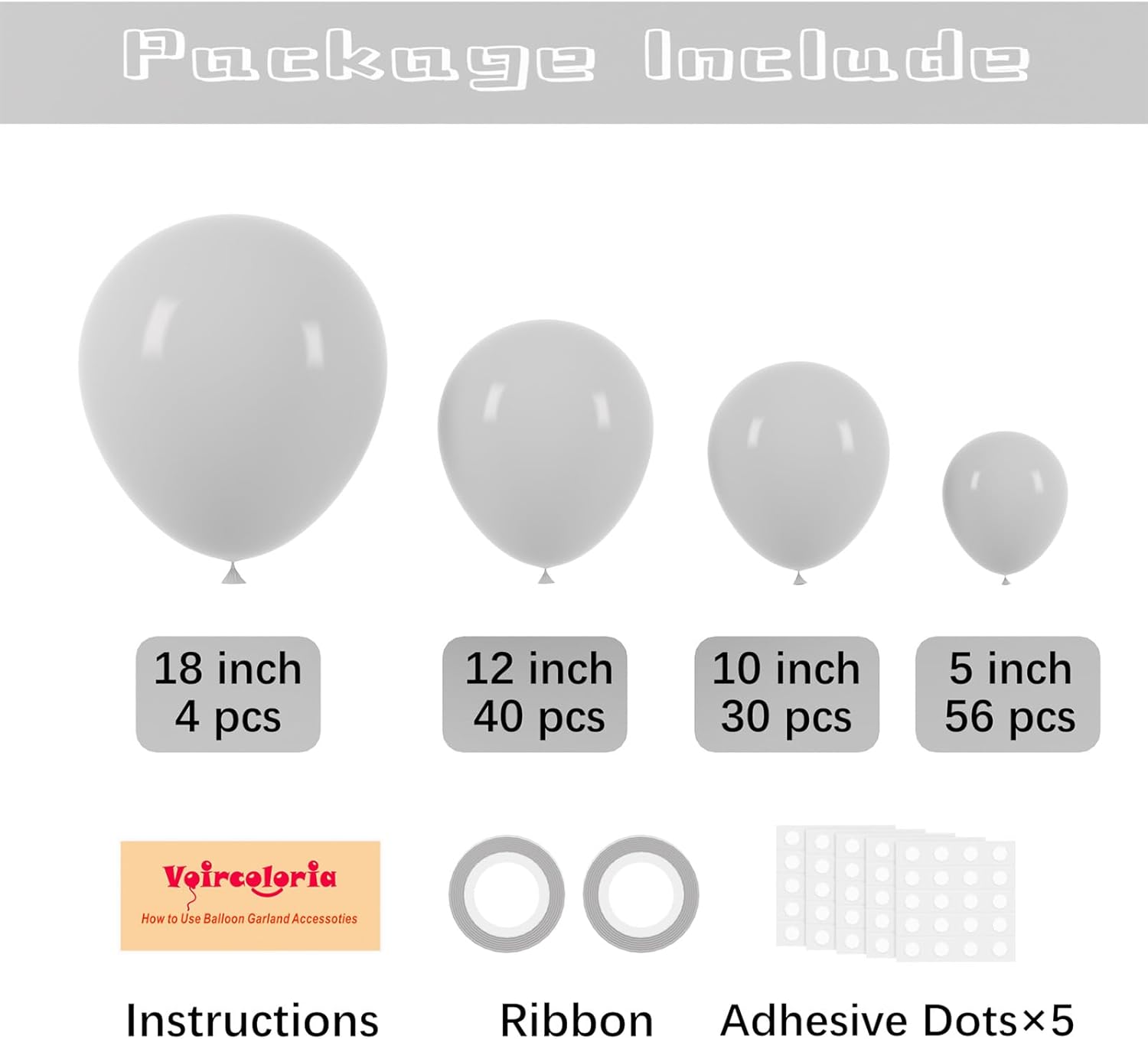 - 130pcs Gray Balloons Set: The package includes 56pcs 5inch, 30pcs 10inch, 40pcs 12inch, 4pcs 18inch, 1 roll of ribbon, 1 roll of adhesive dots(100pcs), 1pcs balloon decorating strip. 5"+10"+12"+18" different sizes of gray balloon garland kit fully meet your party needs and make your balloon garland kit look more layered