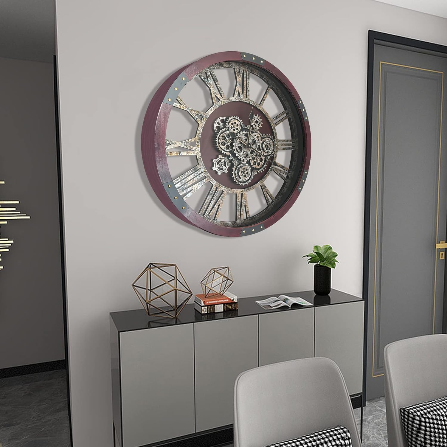 DORBOKER 30" Original Moving Gears Wall Clock, Large Industrial Wall Clock for Living Room Decor, Retro Wood Vintage Farmhouse Steampunk Rustic Clocks for Wall Decor,Cherry Red