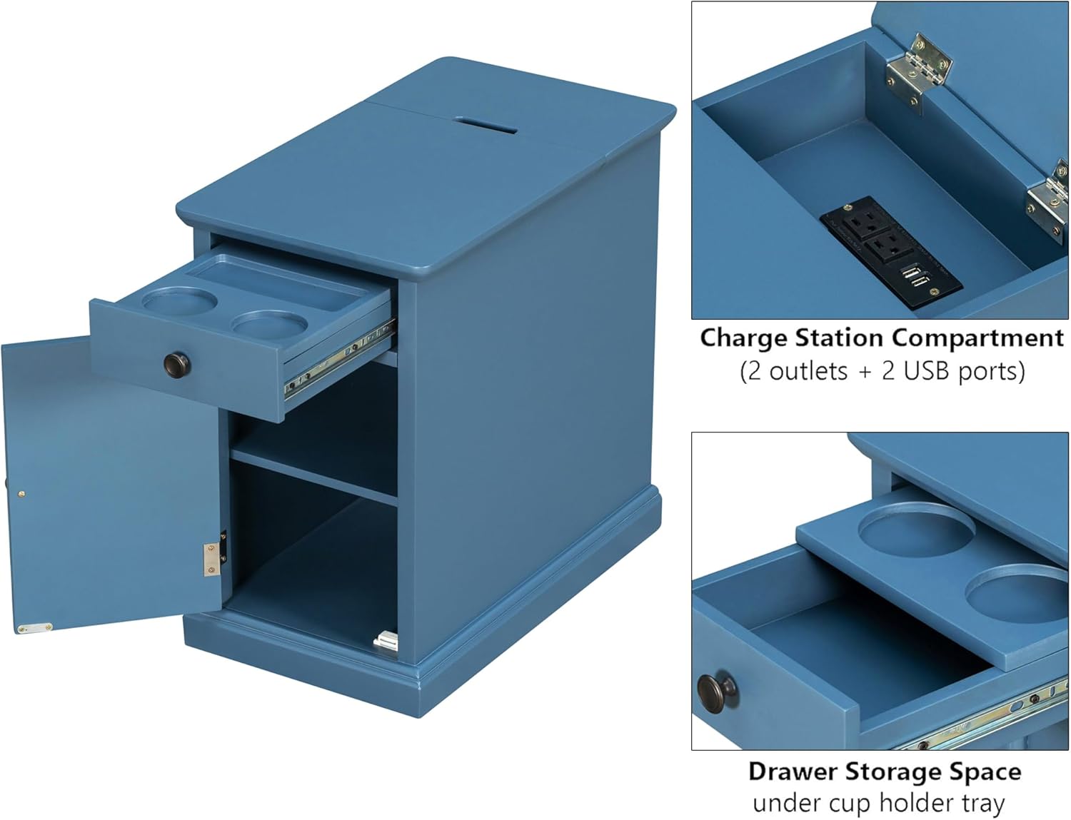 - AWESOME END TABLE: Features 2 hidden USB ports and outlets to have your devices charged conveniently, and a drawer including extra twin cup holders and a remote holder.