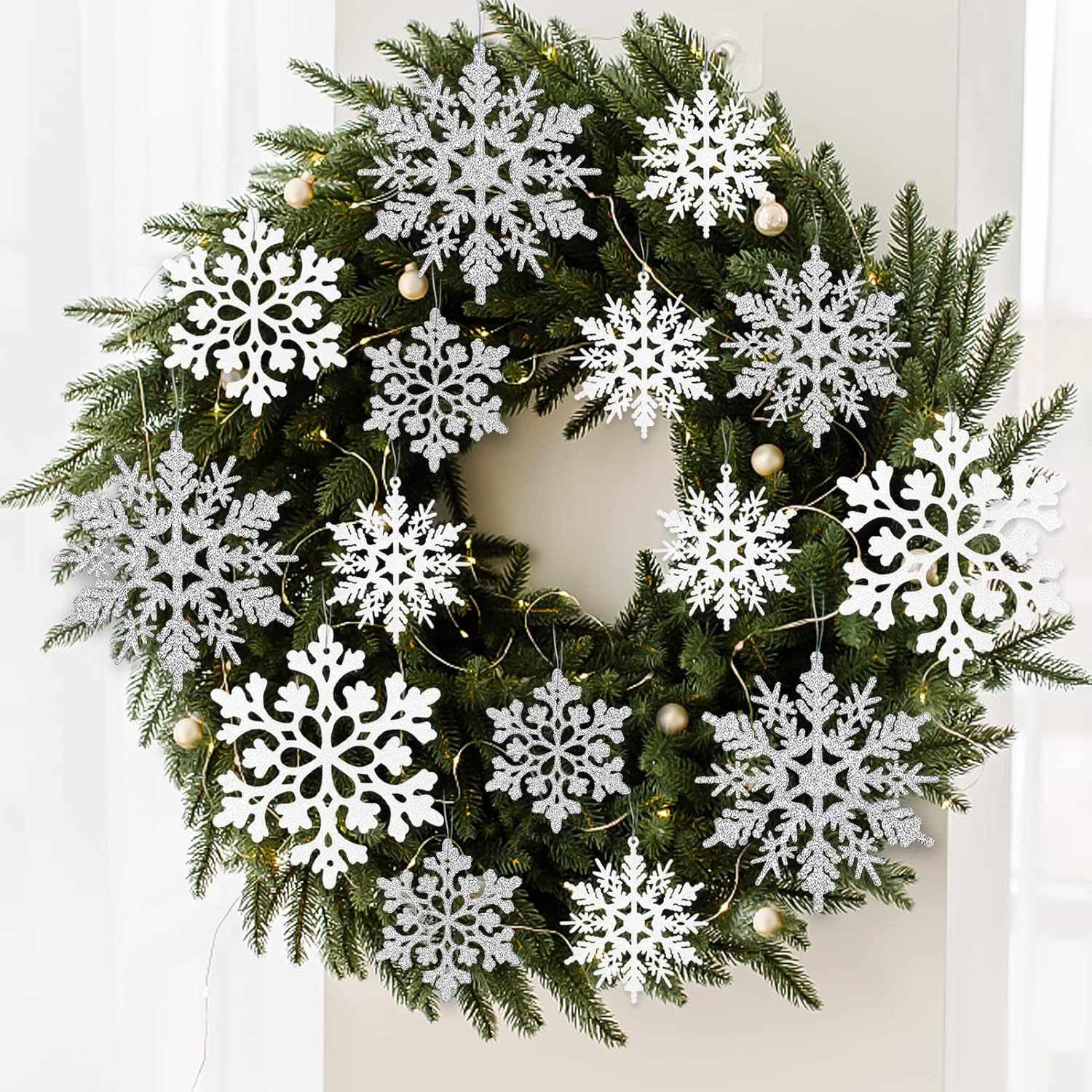 - Easy to Hang & Use:Each glitter Christmas snowflake has a hole or hollow design at the top for easy hanging with the string provided, feel free to hang them on Christmas trees, walls, ceilings, windows, fireplaces, porches, mantles, doors, bedrooms, etc., which will immediately add a more festive atmosphere to your winter home decor