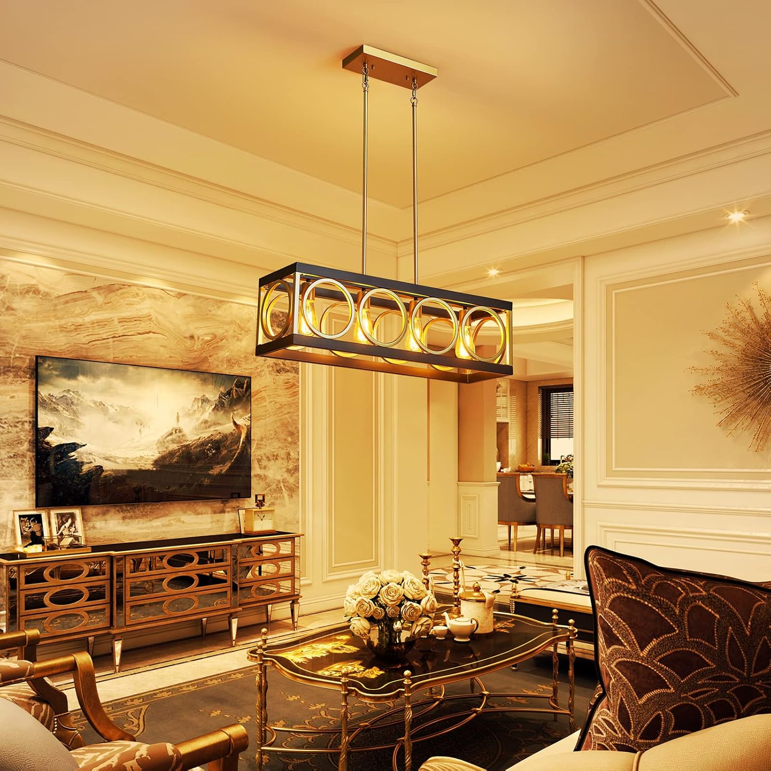 XINGQI Modern Rectangle Chandelier, Farmhouse Kitchen Island Lighting Rustic Industrial Hanging Light Fixture 4-Light Metal Linear Pendant for Dining Room Living Room Hallway, Black and Gold