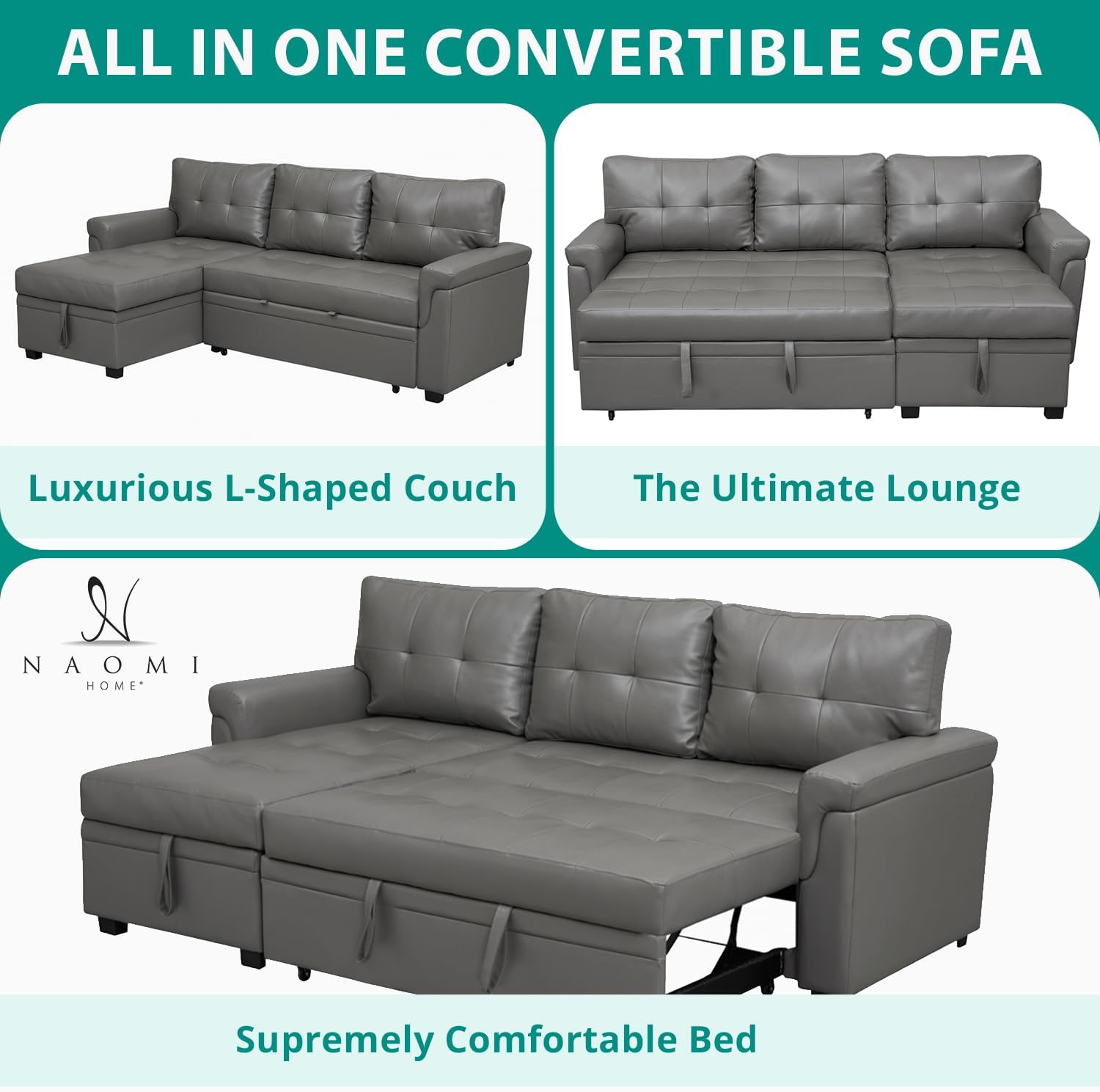 Naomi Home L-Shaped Reversible Sectional Sofa with Pull-Out Sleeper Bed and Storage Chaise, Gray Air Leather