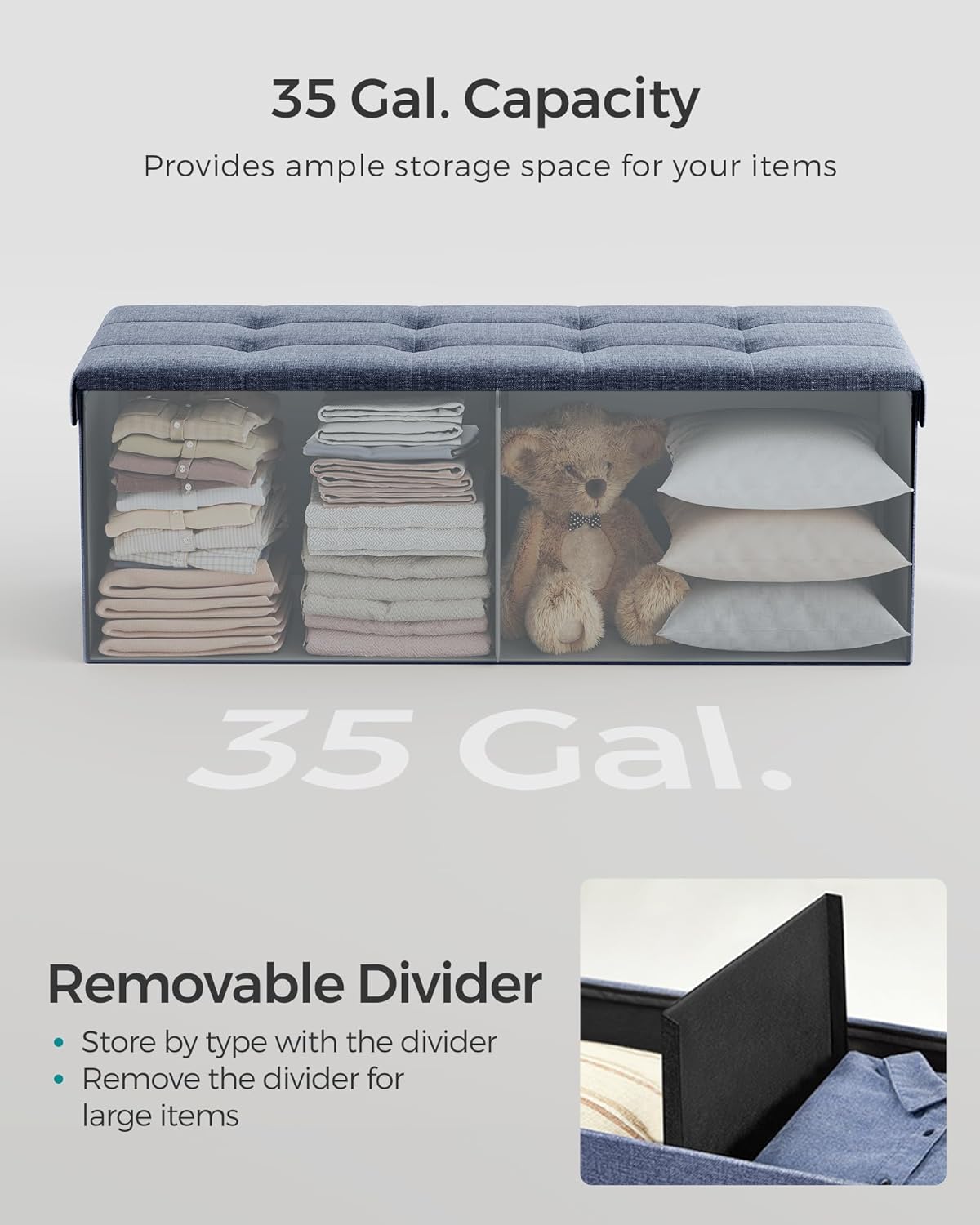 - ăAMPLE STORAGEăMeasuring 15"D x 43"W x 15"H (38 x 110 x 38 cm), this storage bench offers a 35-gallon (131 L) volume. Its removable divider keeps your books, clothes, and blankets neatly sorted, or stores larger items like bed sheets