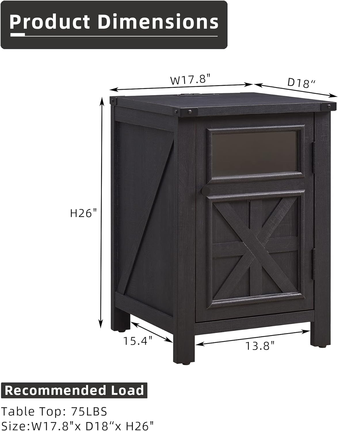 JXQTLINGMU Farmhouse End Table with Charging Station, 18'' Rustic Nightstand with Barn Door & Adjustable Shelf, Wooden Sofa Side Table with 3-Tier Storage for Living Room, Bedroom, Black