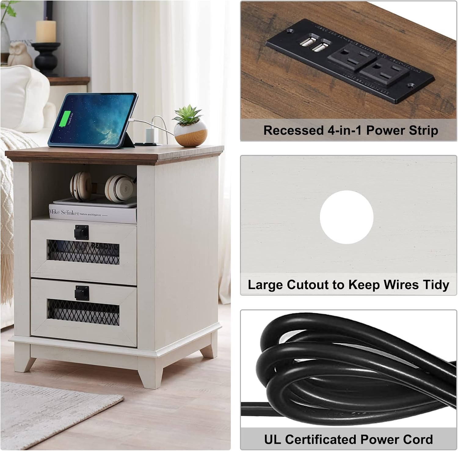 Nightstand with Charging Station,OKD 18'' Industrial & Farmhouse Square End Table w/ 2 Drawers & Open Cubby, Rustic Mesh Drawer Sofa Side Table w/Storage for Bedroom, Living Room Office, Antique White