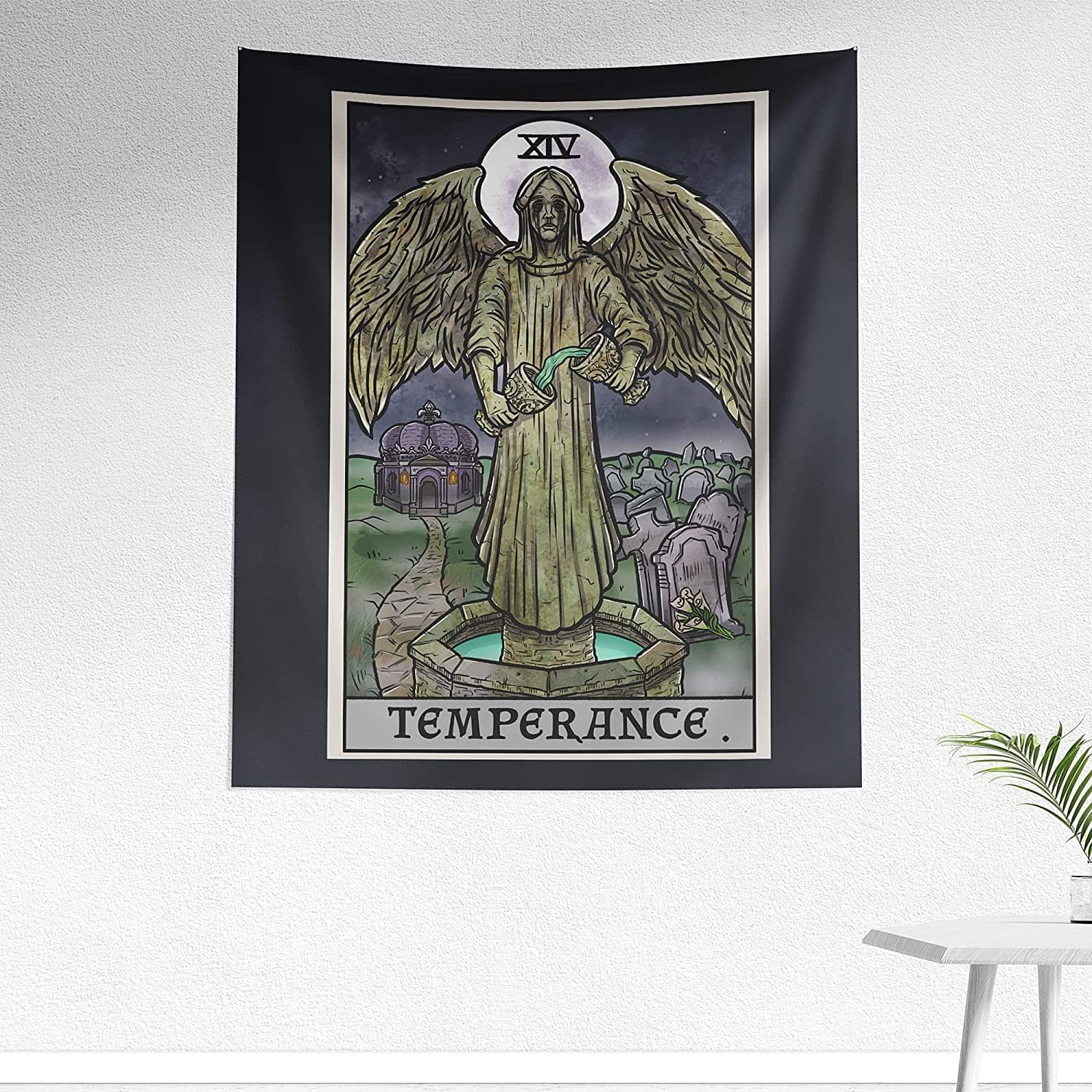 The Ghoulish Garb Temperance Tarot Card Tapestry - Crying Angel Statue - Gothic Halloween Home Decor Wall Hanging (60" x 50")