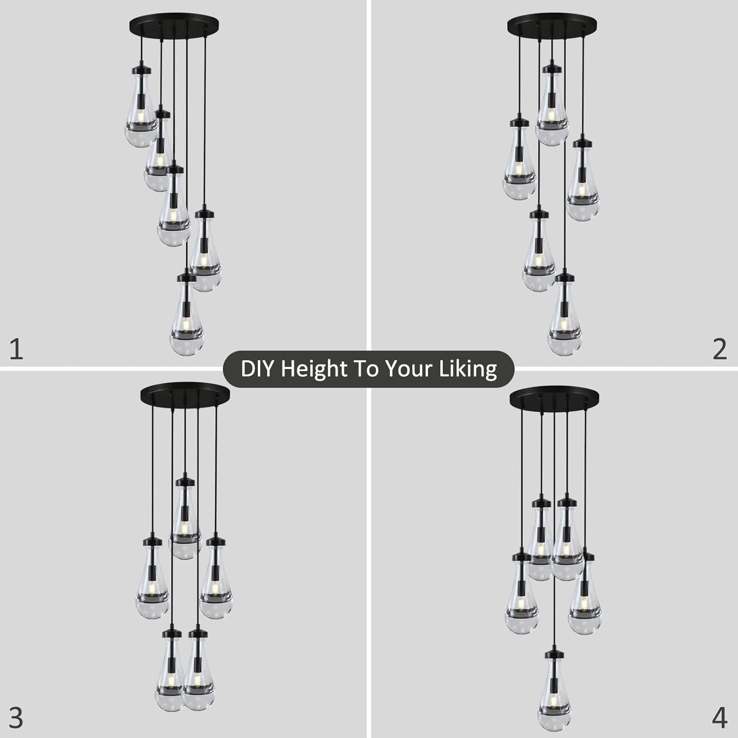 - 【DIY Your Preferred Height】Morden 5-light black raindrop pendant lighting features an adjustable hanging rope. You can freely adjust the hanging rope length according to the height of the ceiling in your home to achieve the effect you want. The total length of the hanging rope is 100". the total weight of the raindrop cluster pendant lights kitchen island is 35 lb, and each raindrop shade can weigh up to 7 lb.